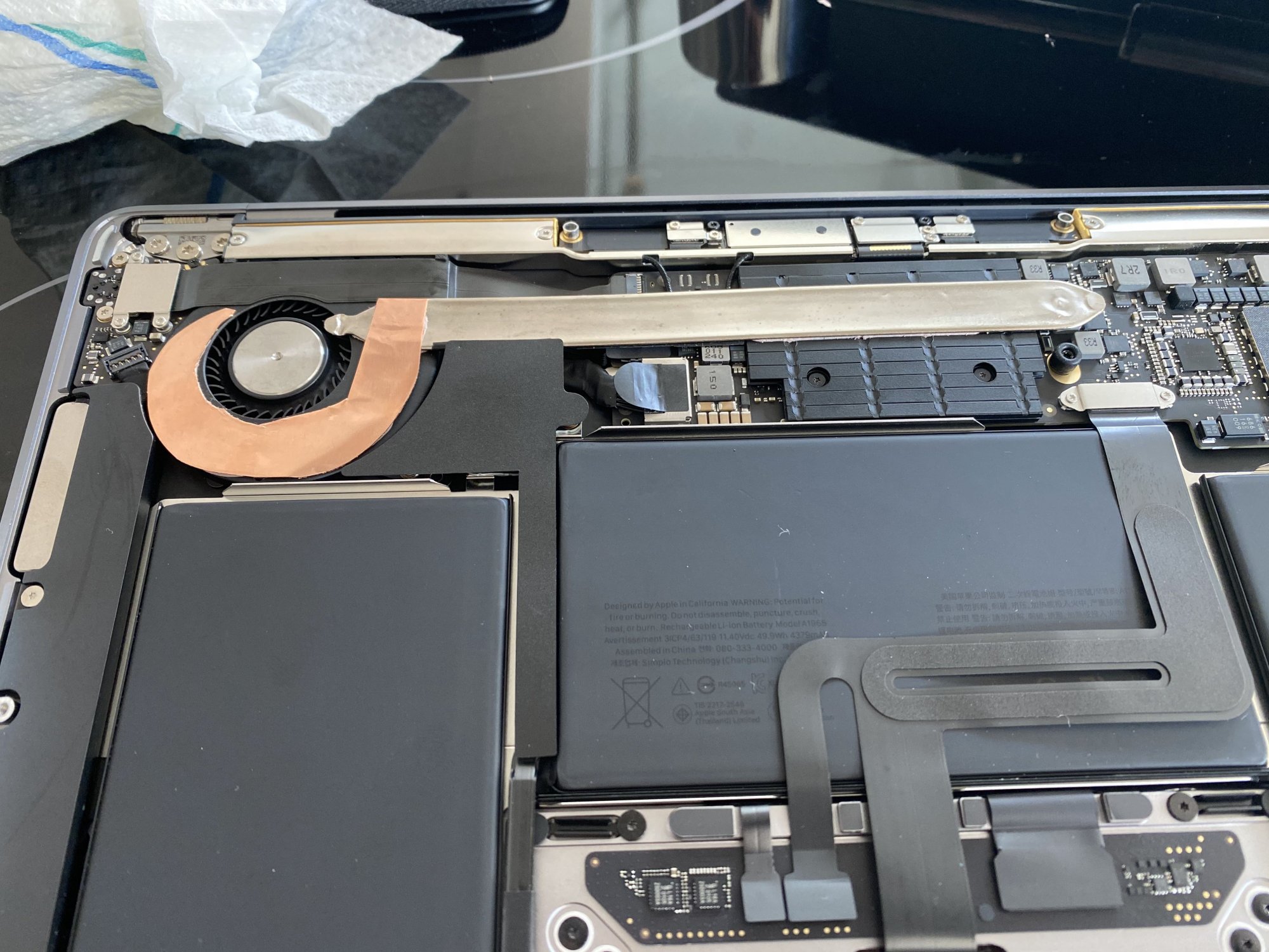 The next change was the removal of the thermal insulator on the bottom cover, with the insulator removed there was less heat transferred to the bottom case and the temps seemed to drop much faster when they did spike due to usage demands. Slight increase in scores over in GB5 and during sustained loads (parallels Win10 (idling on the desktop), Safari 4 - 7 tabs) temps never stayed at 100C very long and once normalized sat around 88C give or take a few degrees.