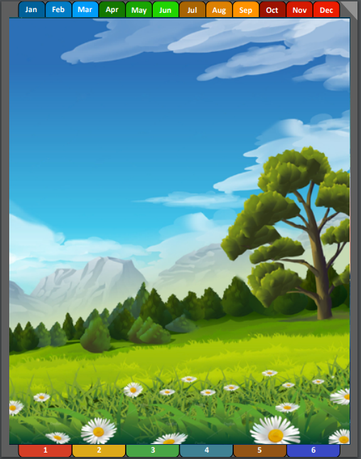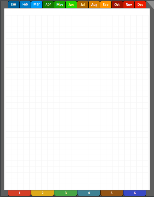 Along the top are tabs that take you to the beginning of each month. The dog-ear in the upper right corner will take you back to the cover from anywhere in the notebook. (helpful when you are on a page with confidential information and need to hide it quickly)
