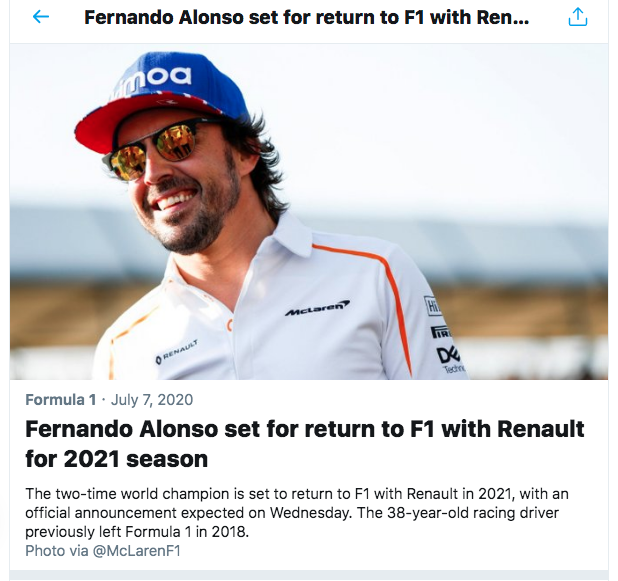 The two-time world champion is set to return to F1 with Renault in 2021, with an official announcement expected on Wednesday. The 38-year-old racing driver previously left Formula 1 in 2018.twitter.com