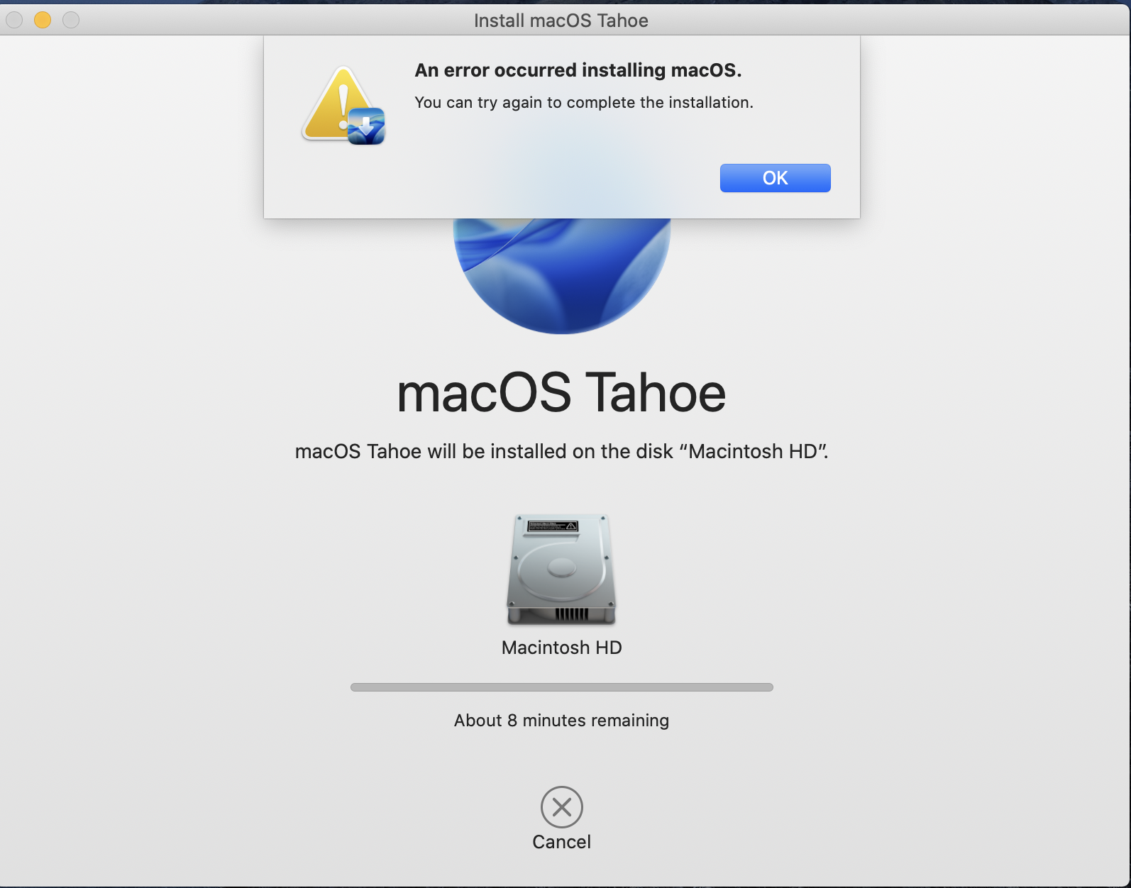 Further attempts to upgrade from Monterey 12.7.4 to Sonoma 14, Sequoia 15 or Tahoe 26 have all resulted in that error.