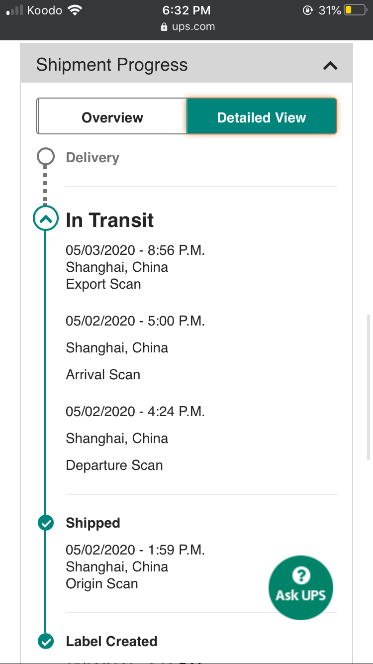 Ordered: 16 April, predicted delivery date 5 - 13 May