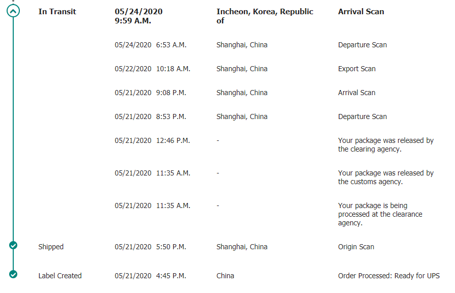| In Transit | 05/25/2020 10:40 A.M. | Incheon, Korea, Republic of | Departure Scan | |