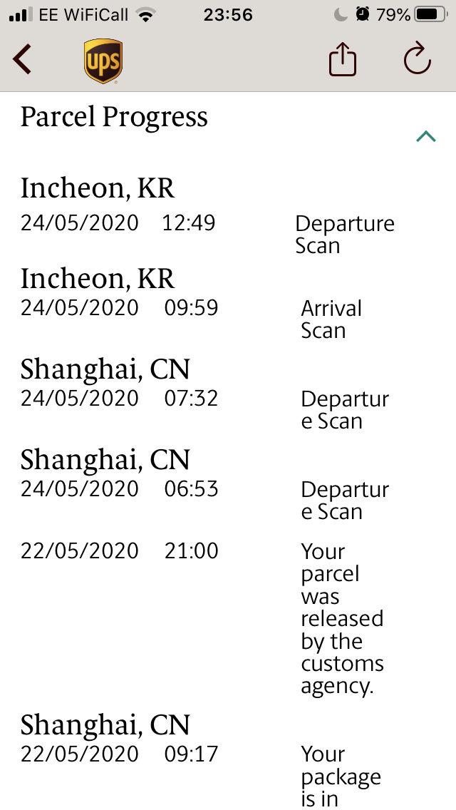 | 05/24/2020 12:49 P.M. | Incheon, Korea, Republic of | Departure Scan | ||