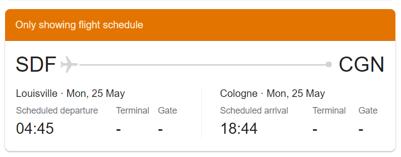 Edit added: from Louisville (US) to Cologne (GE), it normally have a schedule flight at 4:00 am but our airplane will arrive at 1 pm so that would need to wait until tomorrow (26th). Cologen to UK takes about 1 day (27th) so the estimate time (28th) should be correct.