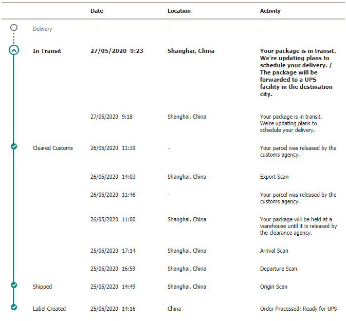 UPS had a delivery date on 28th at first, but now it doesn't have a date anymore, it's saying that it's "In transit" since yesterday morning, last update was in Shanghai. Called UPS and basically the support just said the information that is on the website, not really helpful.
