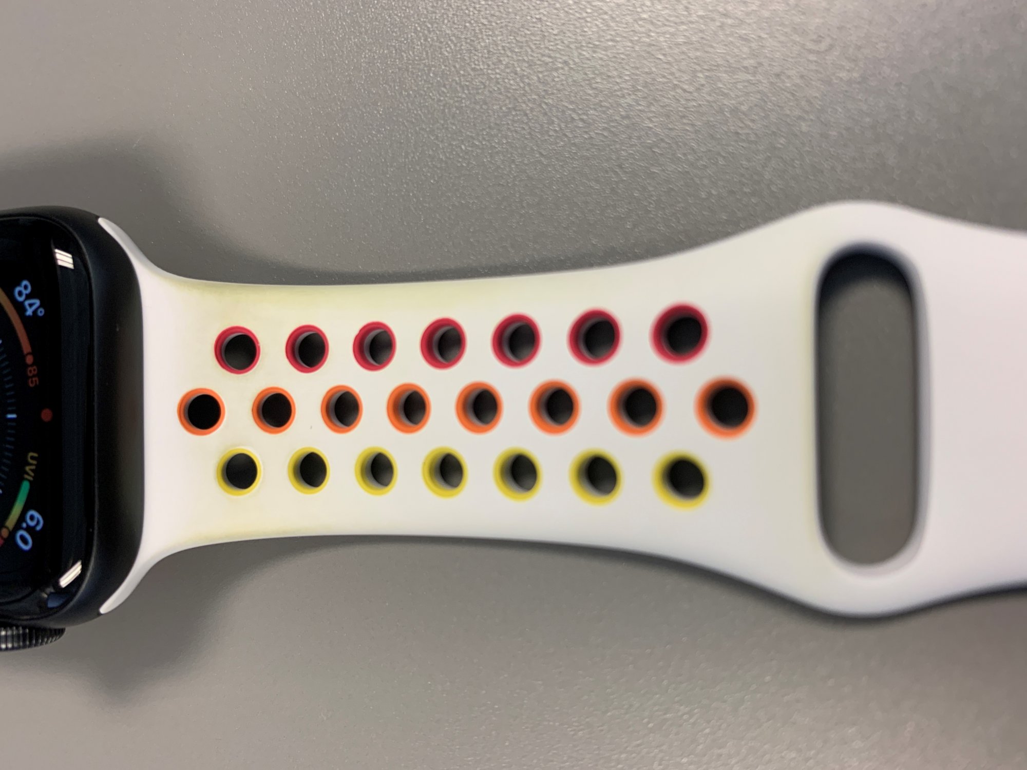 I have this band for a little under a month and the white part is turning yellowish-green. I'm not rubbing my wrist against anything that would mark the band like this - this is the first Apple band I've owned that has discolored which leads me to believe it is a defect. I tried washing it with soap & water - didn't help. I talked with an Apple Support person yesterday and the guy said Apple will not exchange the band being that I already have it about a month - but he offered me to instead pay for a new band - how nice. I refused obviously, why would I want to purchase the same band and throw away another $50? Makes no sense.