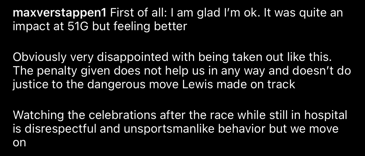 Yeah I’m in disbelief at some of the things I am reading and what was a simple racing incident is being discussed like Lewis intentionally tried to kill him. The fact Red Bull and so many of their social media fans think Lewis would calculate a hit that could well have seen both of them out of the race is beyond absurd. These are two incredibly talented racing drivers and if the roles were reversed, would Max have held the inside line through Copse? You bet your backside he would and if he says he wouldn’t, then he’s not the racing driver he gets the credit for.