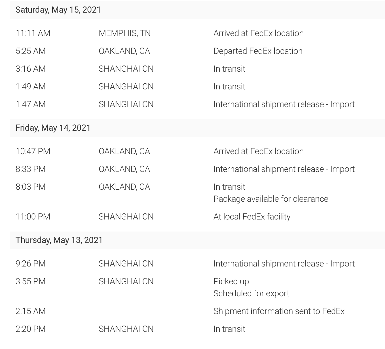 That's BIZARRE!OK - mine must be more interested in frequent flier miles --- Note: I live 60 miles from Oakland CA... here is what FedEx says (delivery on May 21)