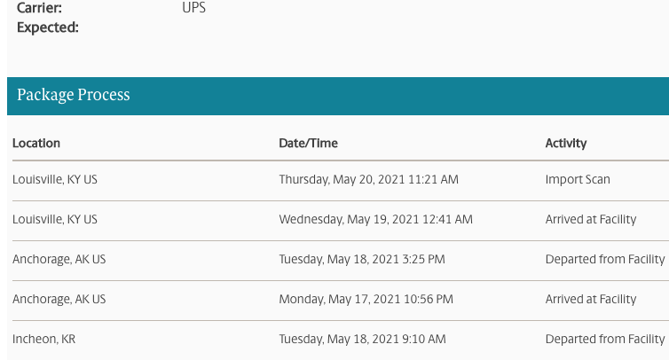 The order confirmation said shipping May 26~31, the order page said May 31 the whole time (and "Processing" up until now).