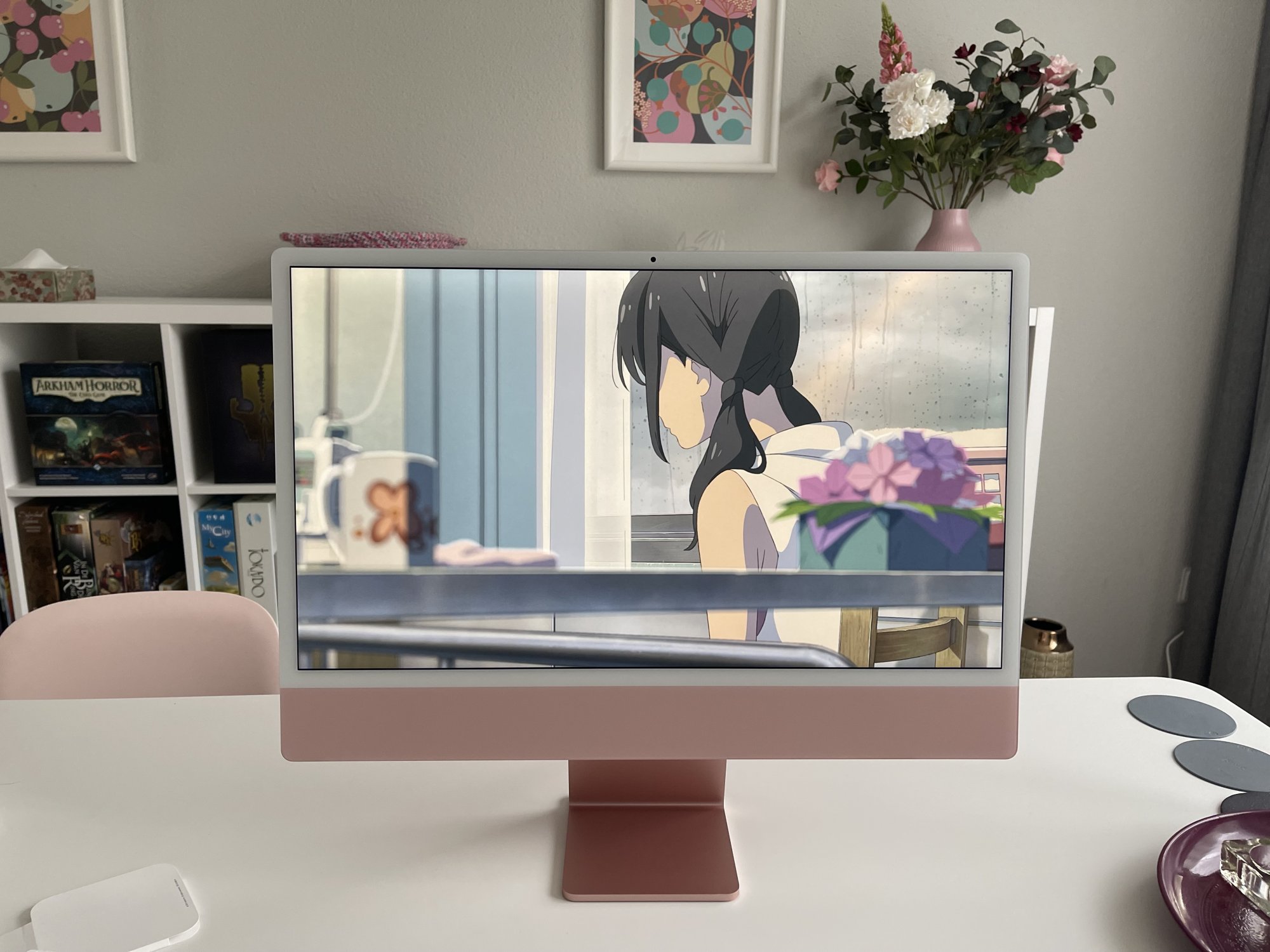 So true. The machine just sits so flush into the environment!Thank you for sharing the photo. The "pink" is so muted and beautiful that it looks professional. I agree that the white bezels everyone was so concerned about really do disappear. Congratulations on your new arrival :0))