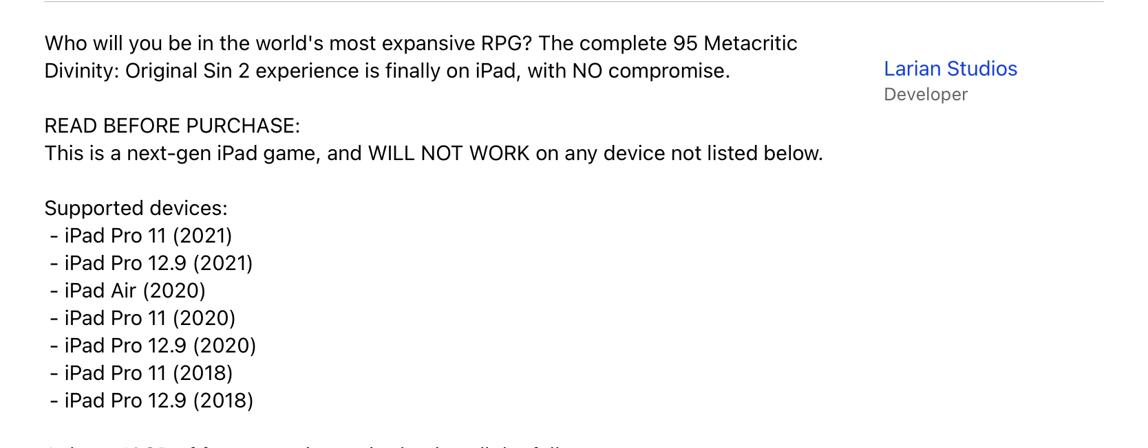 Having said all that about RAM, I must say it doesn‘t seem to be a big deal when it comes to certain apps. That Divinity game people are talking about requires a minimum of an A12, but doesn’t seem to have much RAM requirements. The Air 3, Mini 5 and iPad 8 all have A12 and 3GB RAM, while the 2017 iPad Pros have A10X and 4GB RAM. Some people were advising prospective buyers of the Air 3 in 2019 to opt for the Pro 2017 instead for its extra RAM and better multi-core performance. Looks like those things didn’t matter when it comes to Divinity.