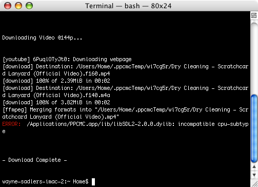 When I try convert media file: (terminal pic)video is of using The scripts used with choob. After I reinstalled, the stream YouTube video on ppcmc started working.I don't think that was from PPCMC. Can you delete /Applications/PPCMC.app and reinstall it? Screenshots could be helpful as well..