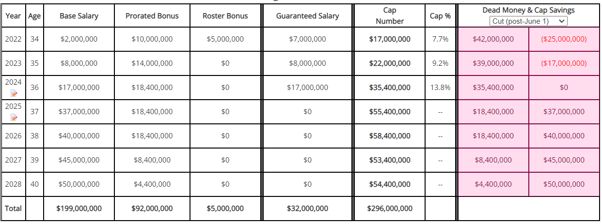 Russell Wilson is signed through 2028, but looking at a post june 1 cut. 2025 looks like it could be financially feasible to cut him. His salary is only guarantied through 2024. Just looking at the numbers here, it doesn't seem likely they'll want to pay him 40 to 50 million dollars when he's on the wrong side of 35I think he is going to have some very issues go forward. So much so I think it may shorten his career.