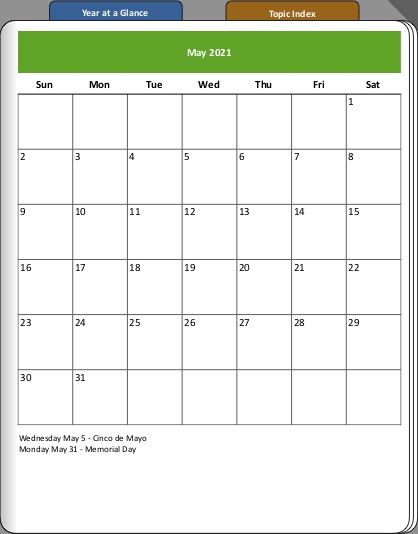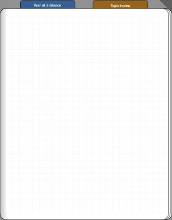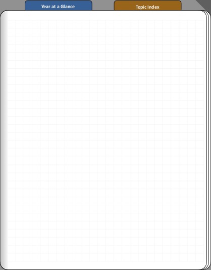 Along the top are two tabs that take you to one of two launch pages. "Year at a Glance" will go to the year overview. From there are hyperlinks to individual months. The "Topic Index" will go to the launch page for topics/categories. The dog-ear in the upper right corner will take you back to the cover from anywhere in the notebook. (helpful when you are on a page with confidential information and need to hide it quickly)