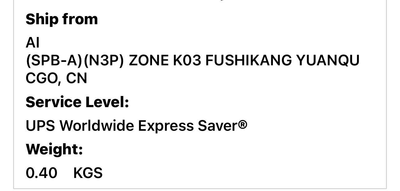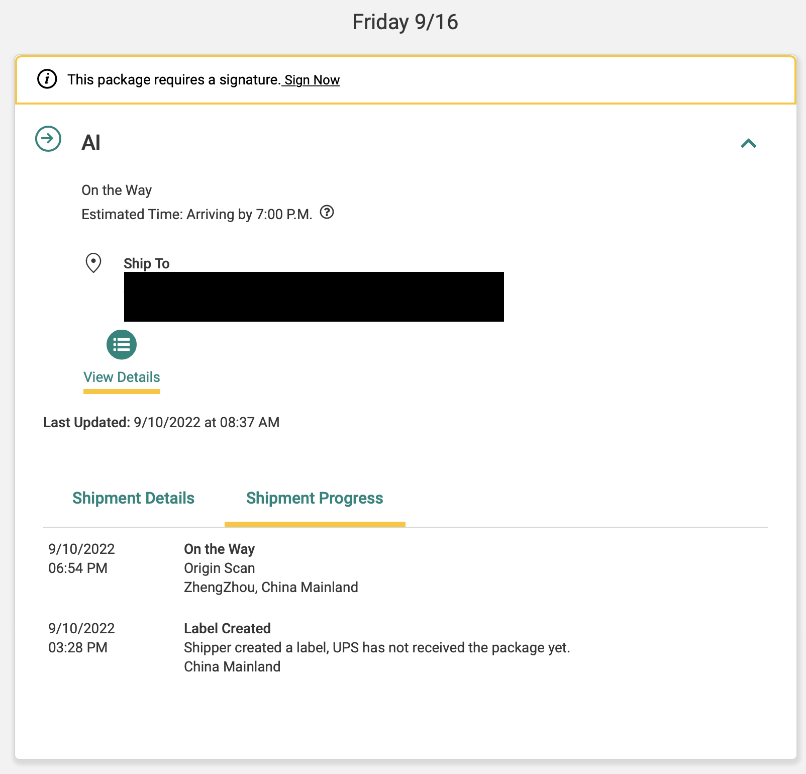 | 9/10/2022 08:45 PM | Label Created Shipper created a label, UPS has not received the package yet. China Mainland |