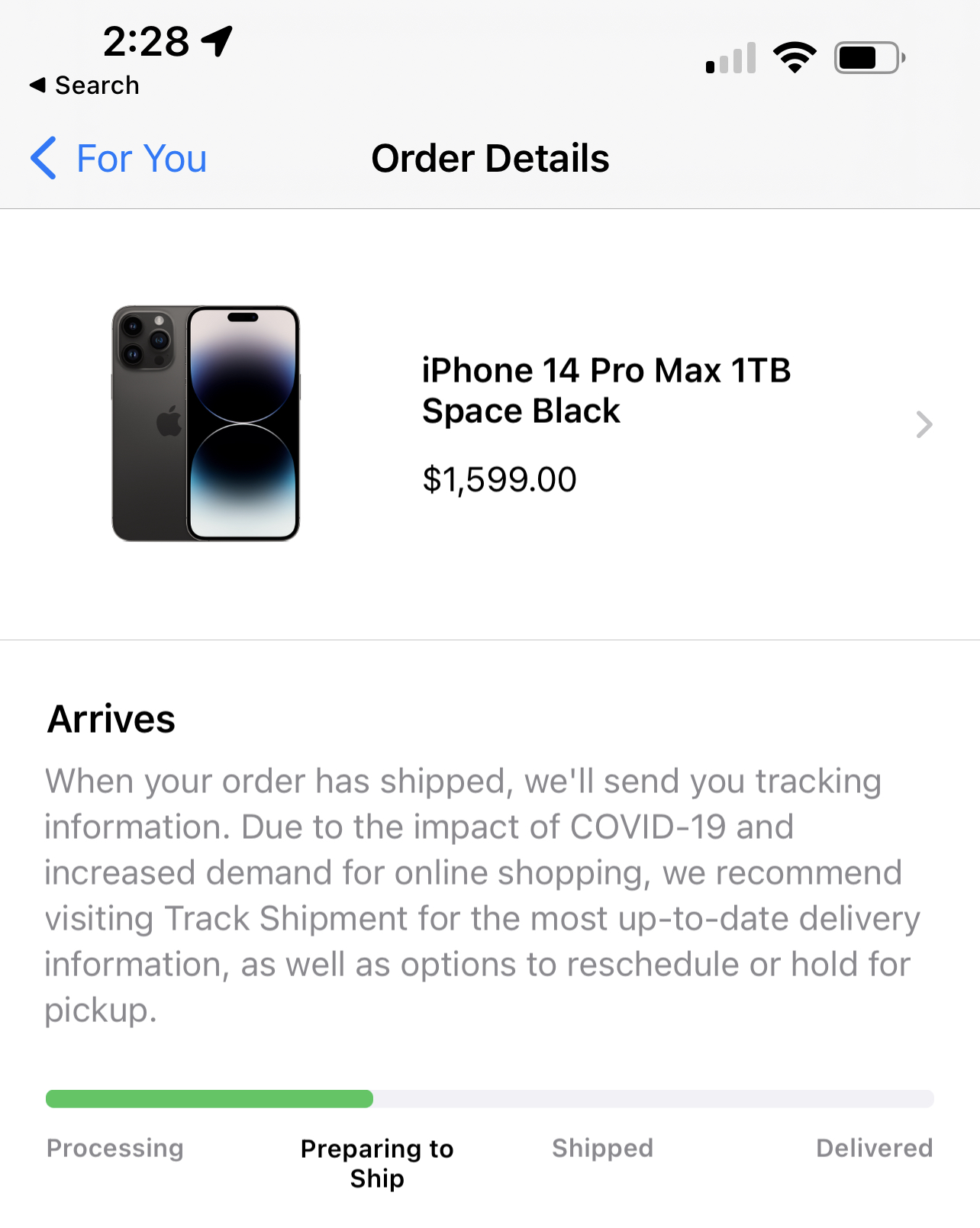Same! Not a lot of people with 1TB have been assigned yet. Stay tuned!There are 2 iPhones preordered to this household - one account ordered a 1TB Purple Pro (Apple Store showing 9/16 delivery) and my account ordered the 1TB Gold Pro Max (Apple Store showing 9/23 delivery.)
