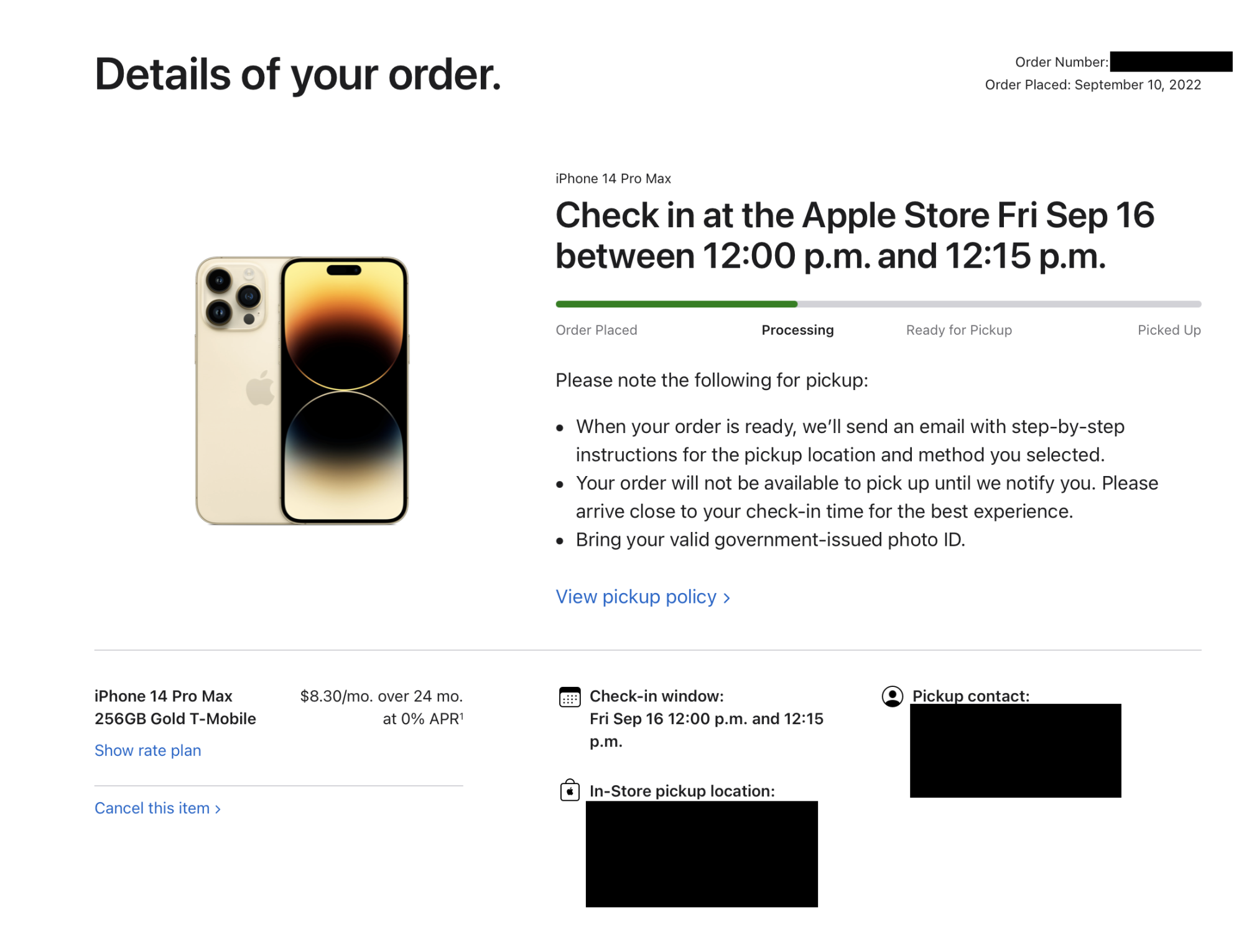 Congrats! Hopefully yours doesn’t change to null like a few others waiting for in store in this thread.After cancelling my original order with Apple (Oct 17th) and a second one with T-Mobile, I just scored an iPhone 14 Pro Max GOLD 256GB for launch day pickupStock changes almost with the minute so you have to be patient and be fast as stock don't last more than 2 or 3 mins. It took me around 1 hour of refreshing until one like the one I got was available.