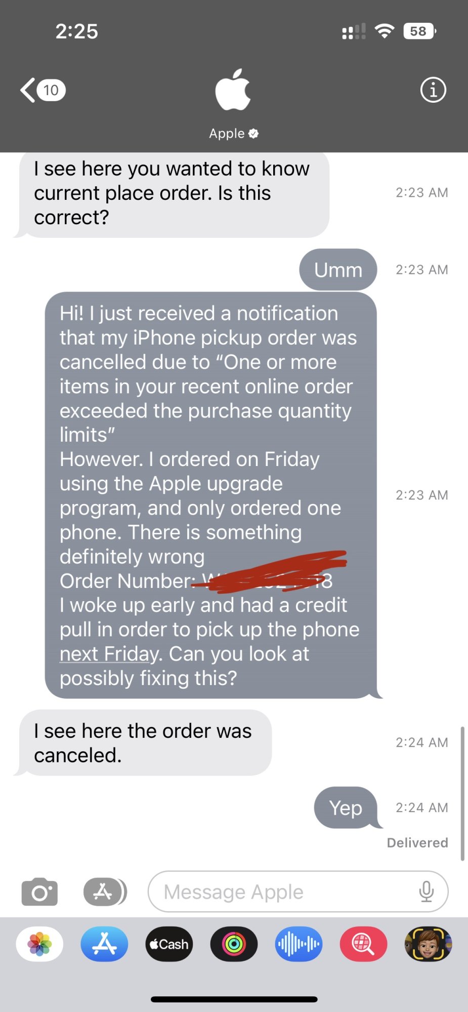 @PatrickBoland Also, call this internal number. This number gets routed directly to the manager's at Apple.com who specializes in Sales, orders and logistics.Don't go with the chat route. Call them. Demand to speak to a manager or supervisor and have them look into it. If they refuse to do so tell them. You only want to speak to a manager.