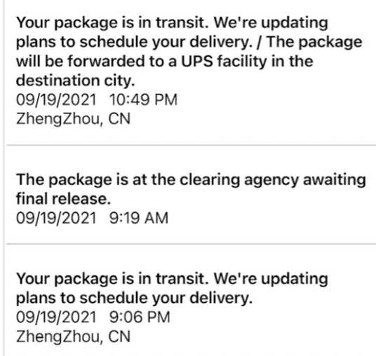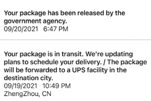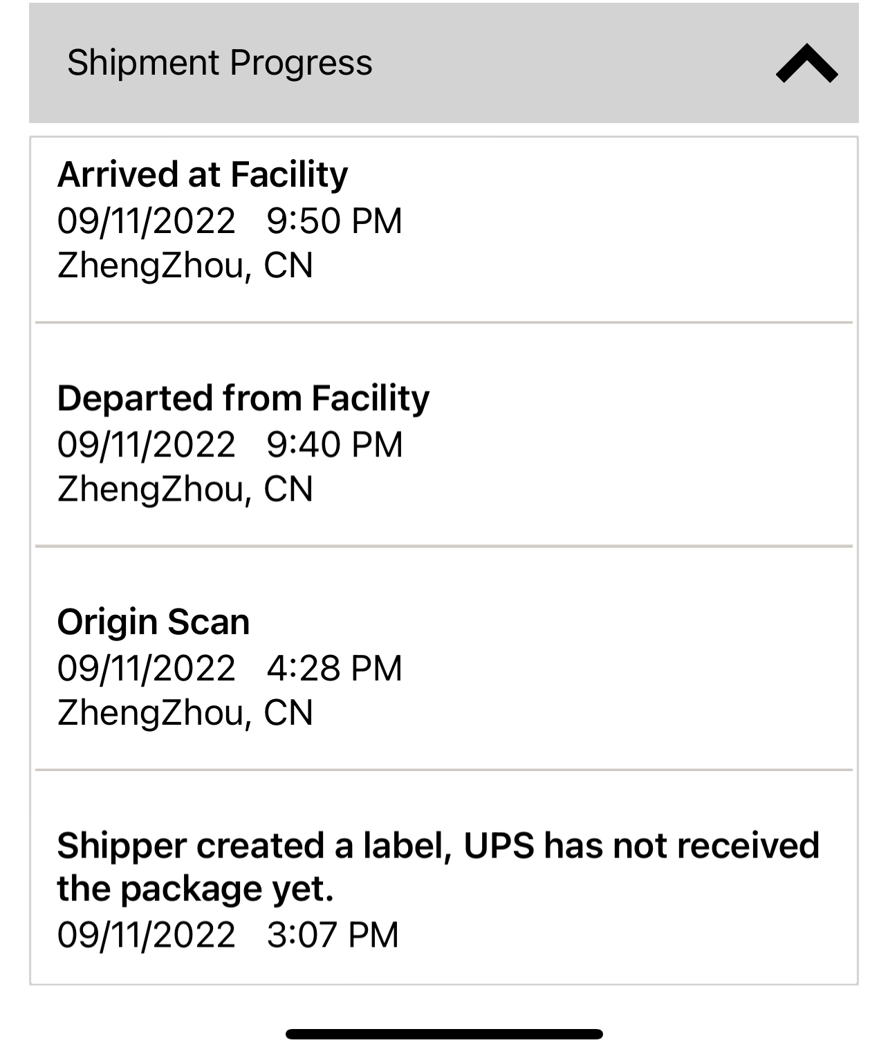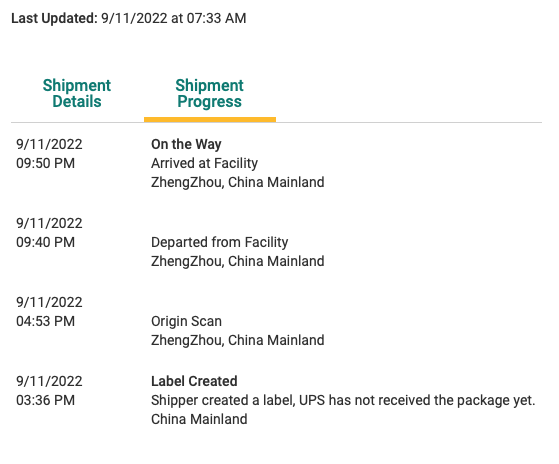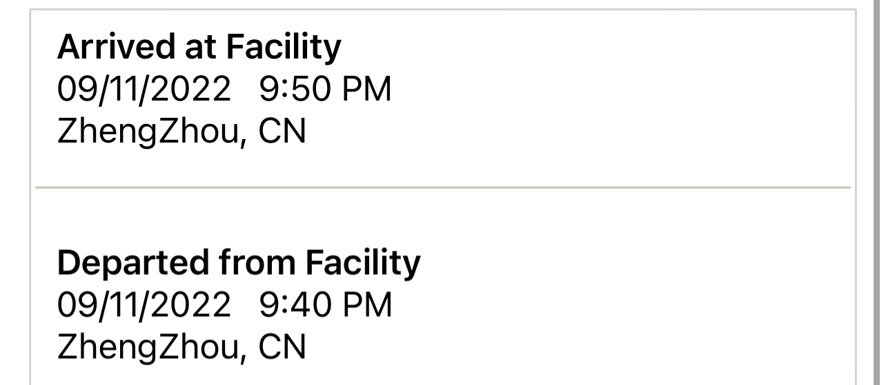 | 09/11/2022 9:40 P.M. | Departed from Facility ZhengZhou, China |