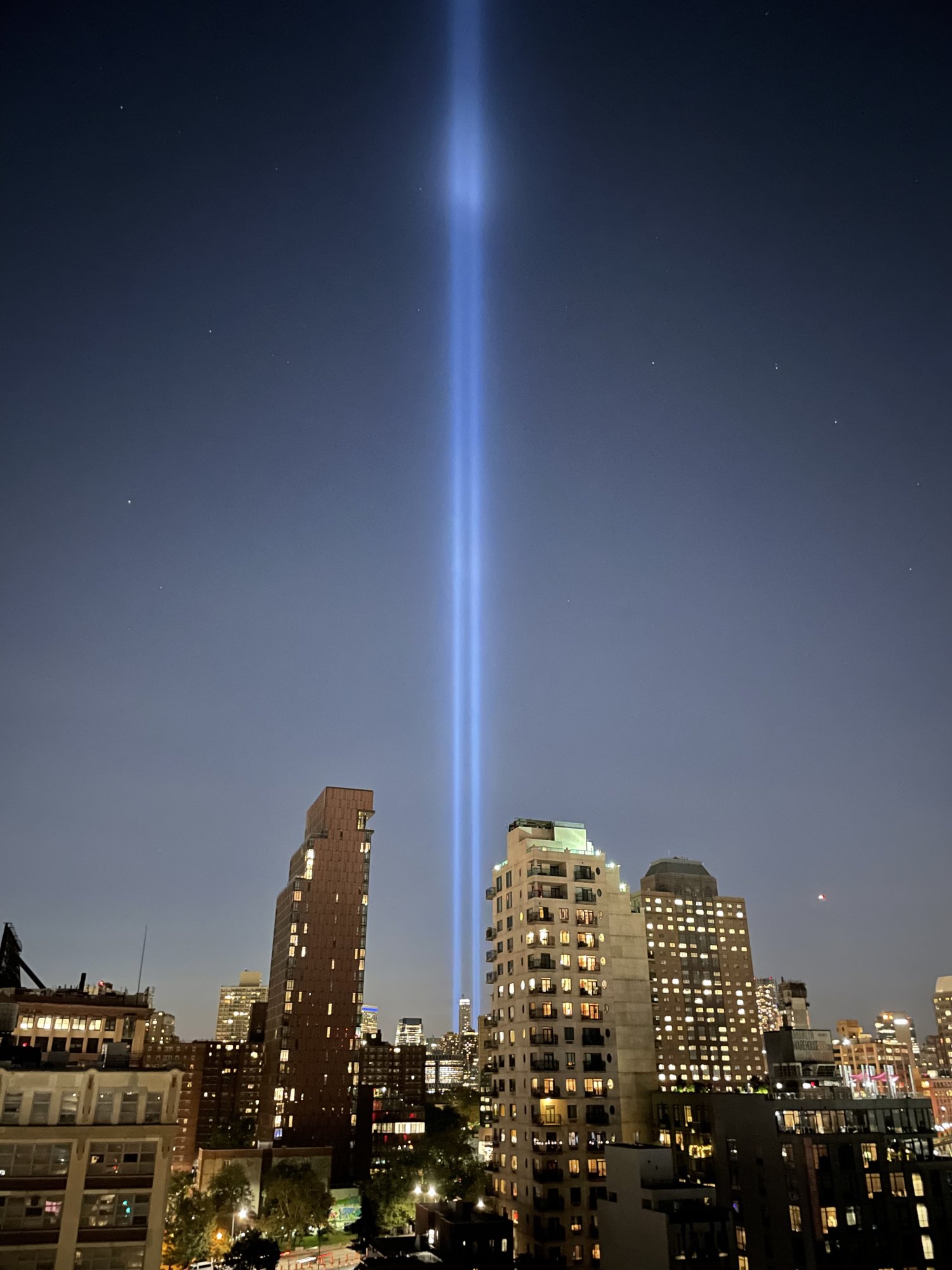 September 11th, 2004. From my rooftop.I won't be unfortunately. I usually can see the Tribute in Light from my rooftop. Sadly, it's super cloudy and rainy today, so I'm not sure. I'll check once the sun sets. Here are the lights from the 20th anniversary (last year) from my rooftop. Really sad reminder each year. 😪