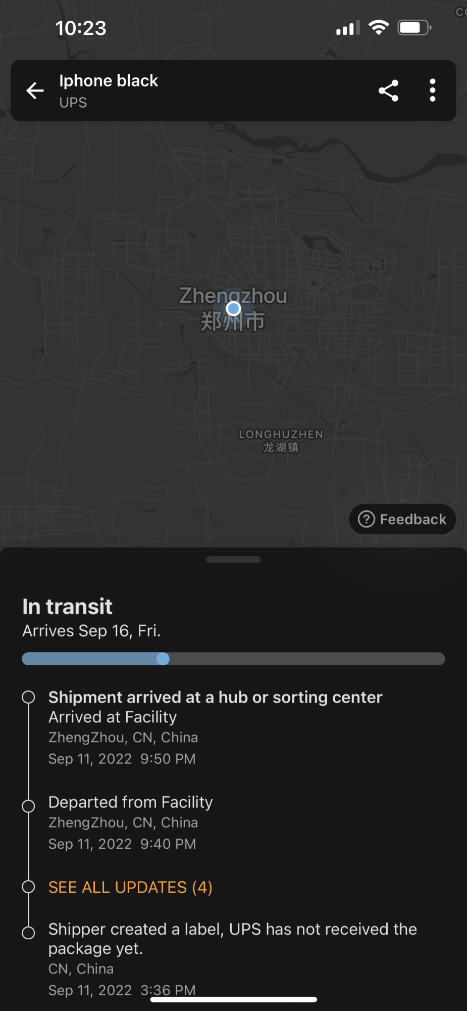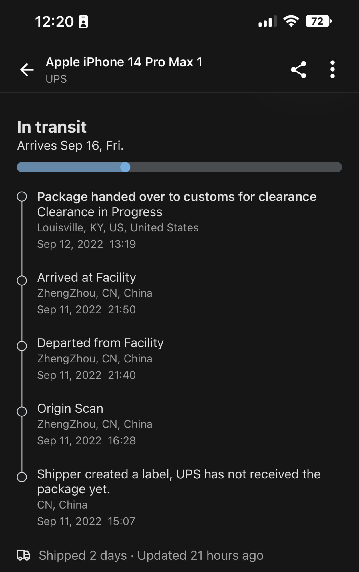 He has the latest iphone 14 feature: teleportation!I just installed the Aftership app and added my UPS tracking info. The app matches what I'm seeing on the UPS website. I'm not sure how this iPhone is already in Louisville when none have left China yet. The tracking in that screenshot doesn't include a departure scan from China or an arrival scan for Alaska.