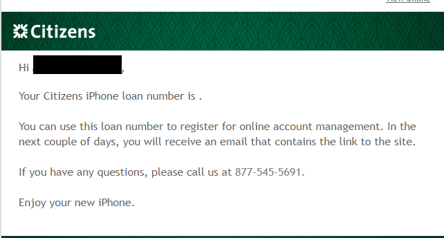 Free loan, free phone.Huh. Got a second email from citizens saying here is your loan number, and it was blank…