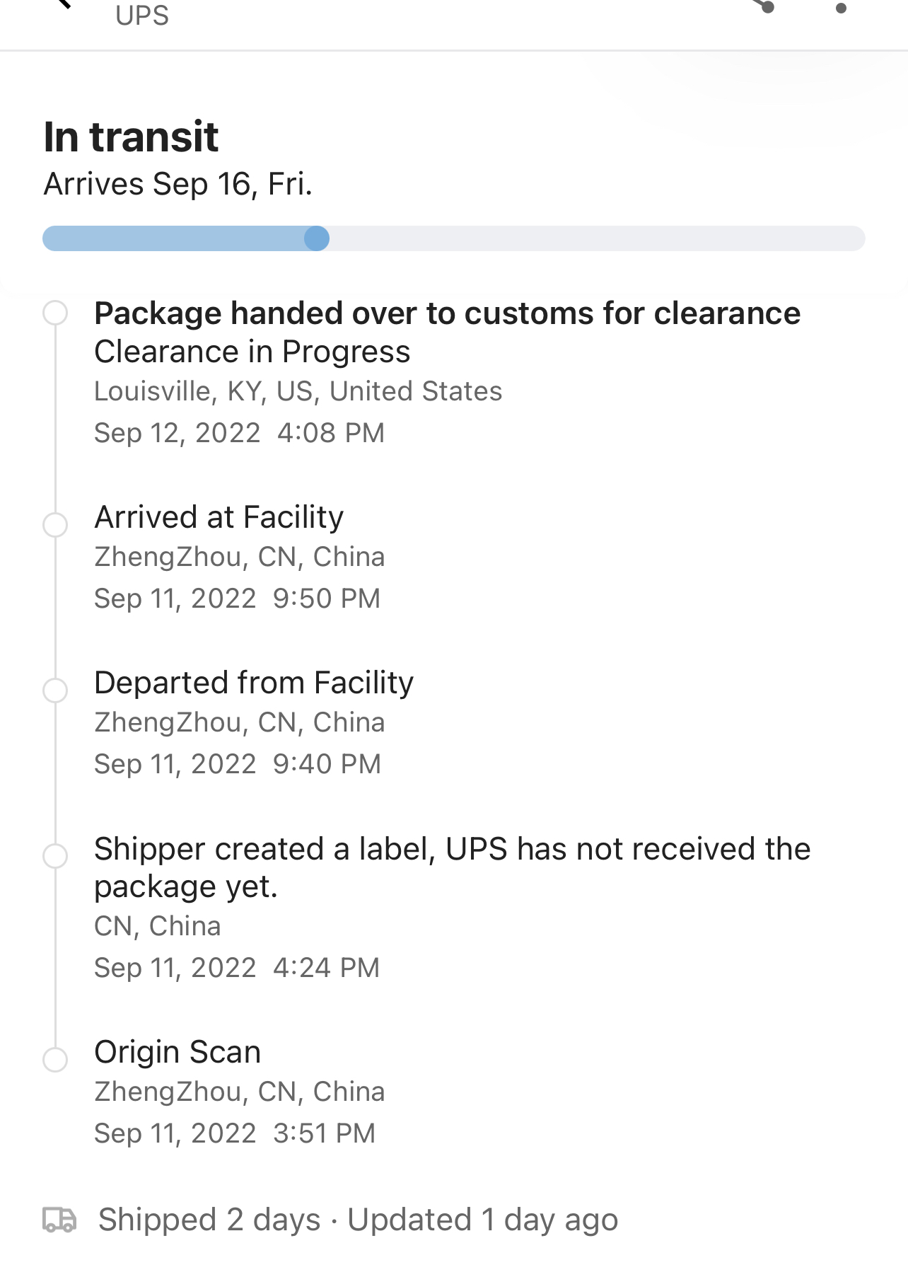This is from AfterShip (I downloaded when @anjo10 wrote about it. The UPS app still shows sitting in Zhengzhou since the 9:50pm scan on the 11th.
