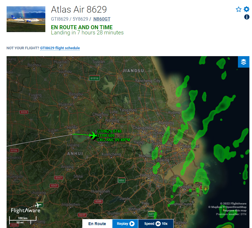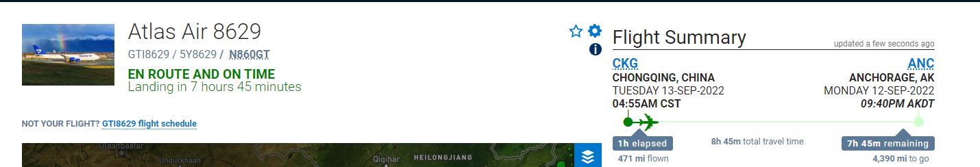 Sometimes they go to Incheon and sit a few days. This is a pretty quick turnaround from order to delivery, so they may just go direct. We'll know when that Atlas flight lands.Hmm. interesting. How do you get that it went from Zhengzhou to Chogqing? Looking that up on a map, it is 735 miles from Foxconn in Zhengzhou to CKG airport traveling West. Wouldnt they just go from CGO to PANC? Not that I am any expert on China to USA cargo flights