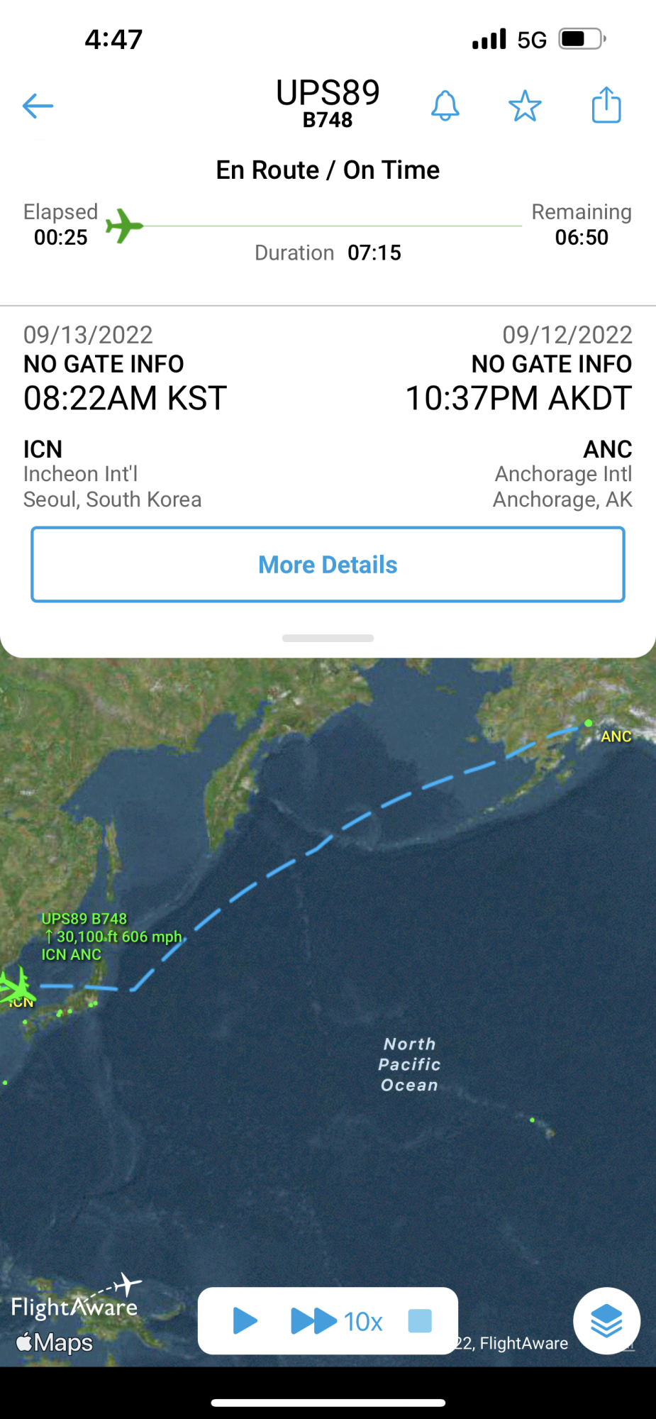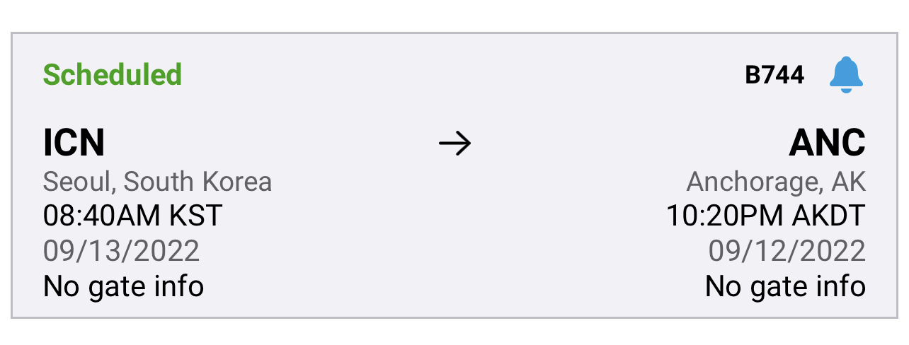 It all depends on the departure scan time. Match the departure scan time on your tracking number on UPS.com with the departure time on a UPS flight leaving South Korea.So which flight should we be looking at to go from Korea to Alaska now?? I am so confused lol