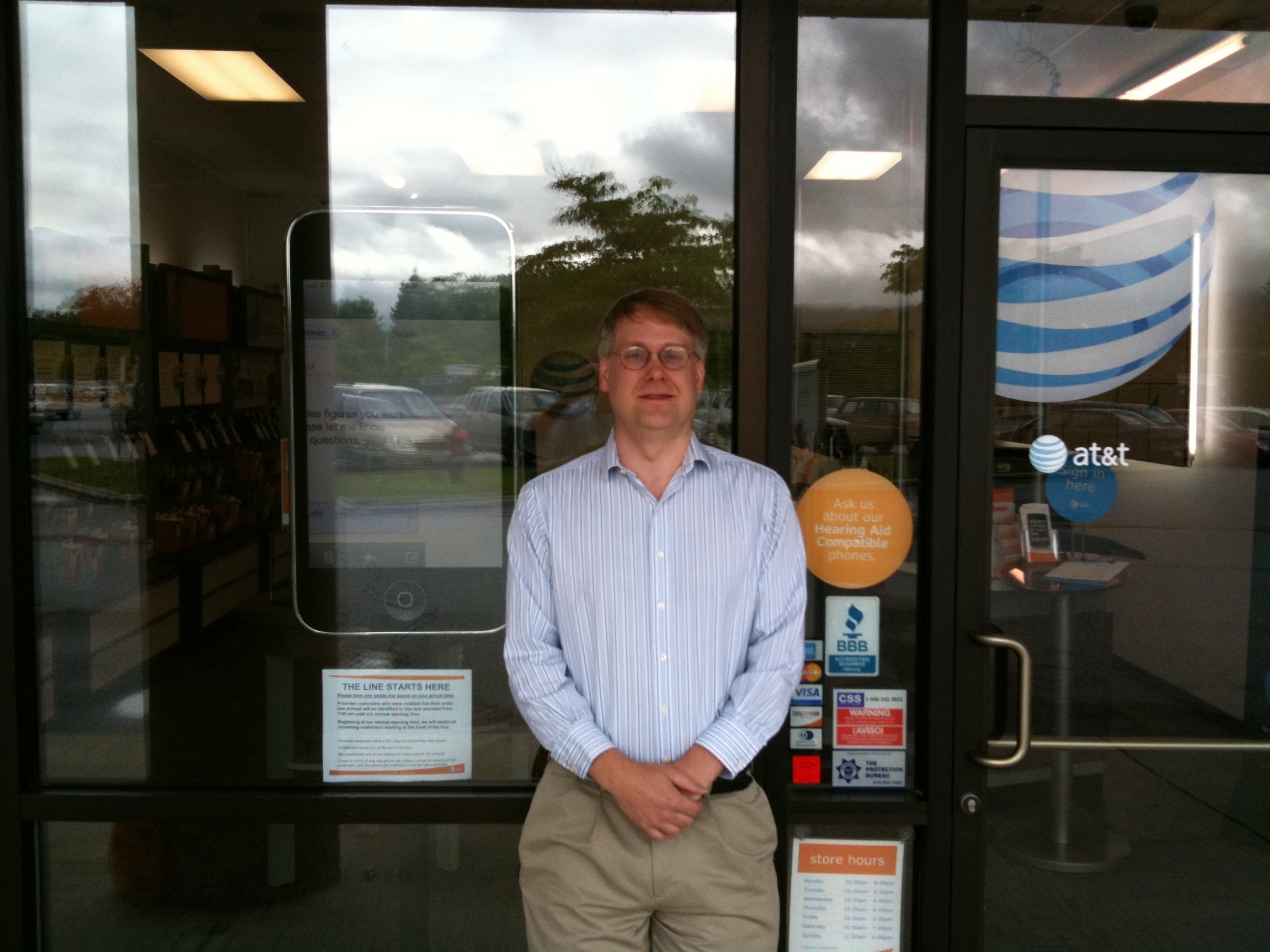 After seeing the fun people were having lining up and camping out at iPhone launches before that, I decided to head down to the local newly minted AT&T store at around 6 am, just in case it was mobbed, and because I thought it would be fun to “camp out in the line". As the store was officially a corporate AT&T store, which at the time was a designation reserved for only the largest flagship stores in big cities, the corporate office had sent out a large pile of bound procedures to be followed, including arrival of all the employees at 4 am, how to lay out the queues and signage, as well as hiring and sending 2 extra security guards for the day etc. This really amused the 3 employees of this small strip mall store in Bennington VT, but they dutifully put up the signs and sent one of the guards out for donuts, as they otherwise had nothing to do.