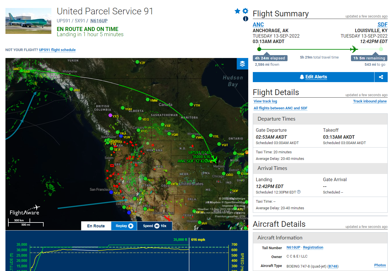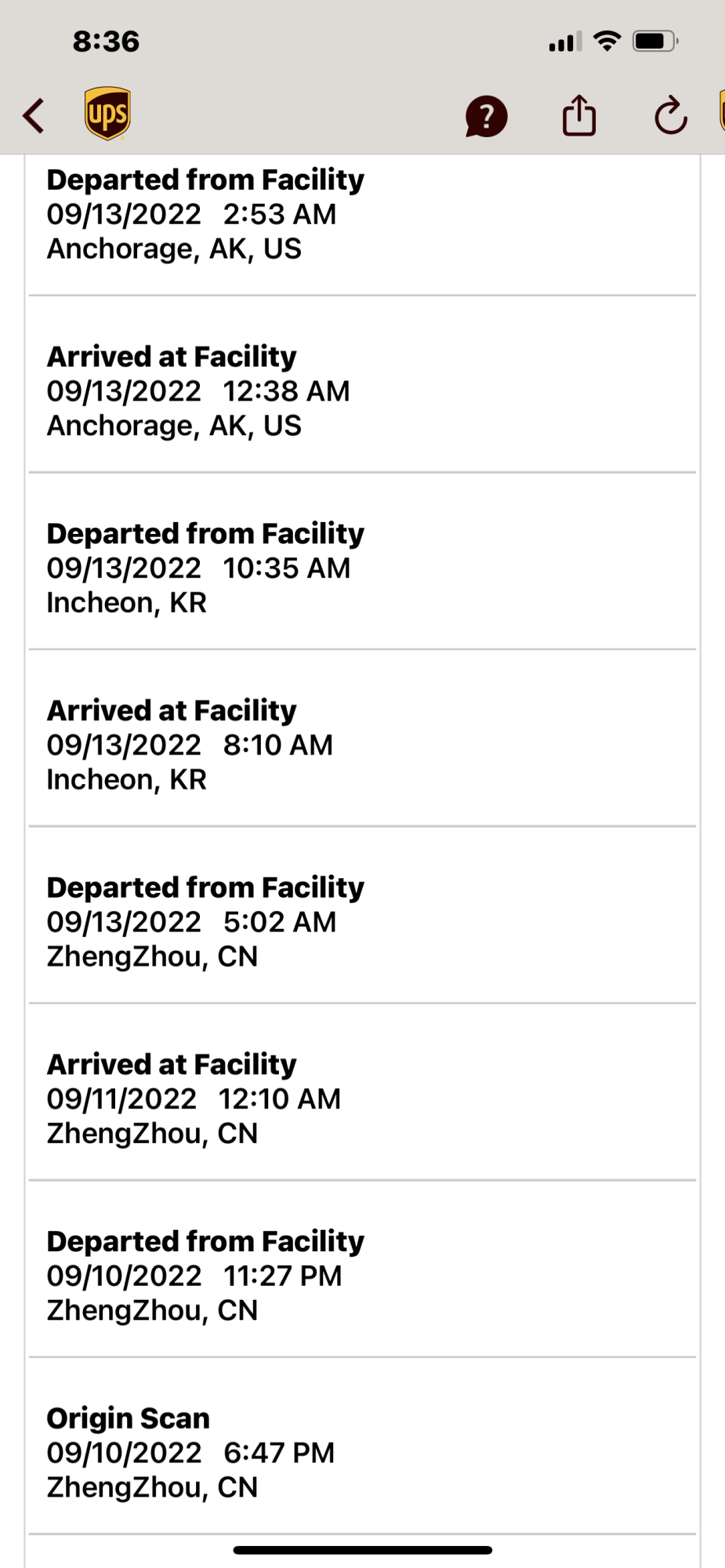- Wife's Deep Purple 256GB Pro departed ZhengZhou, China Mainland at 5:02a (9/13) and arrived in Anchorage at 12:38a (9/13).
