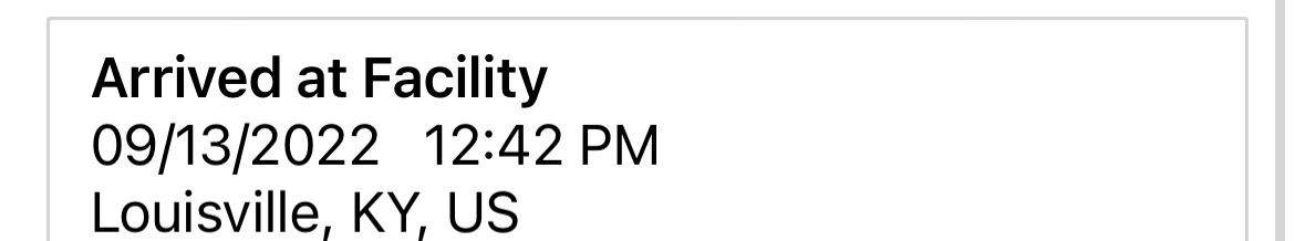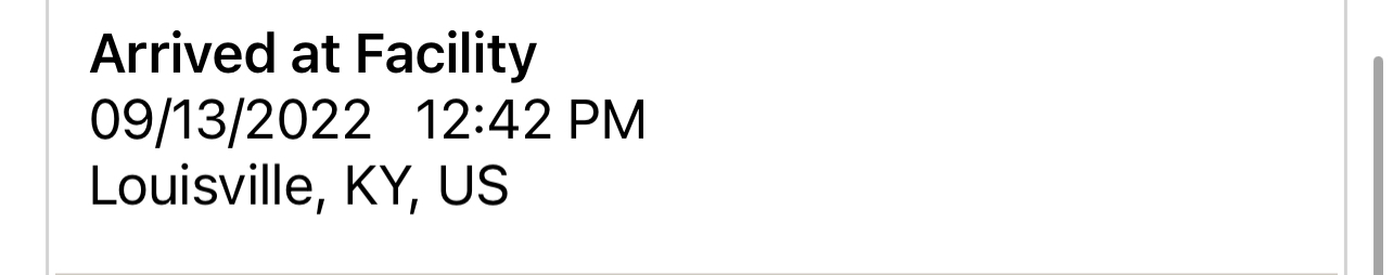 | 09/13/2022 12:42 P.M. | On the Way Arrived at Facility Louisville, KY, United States |