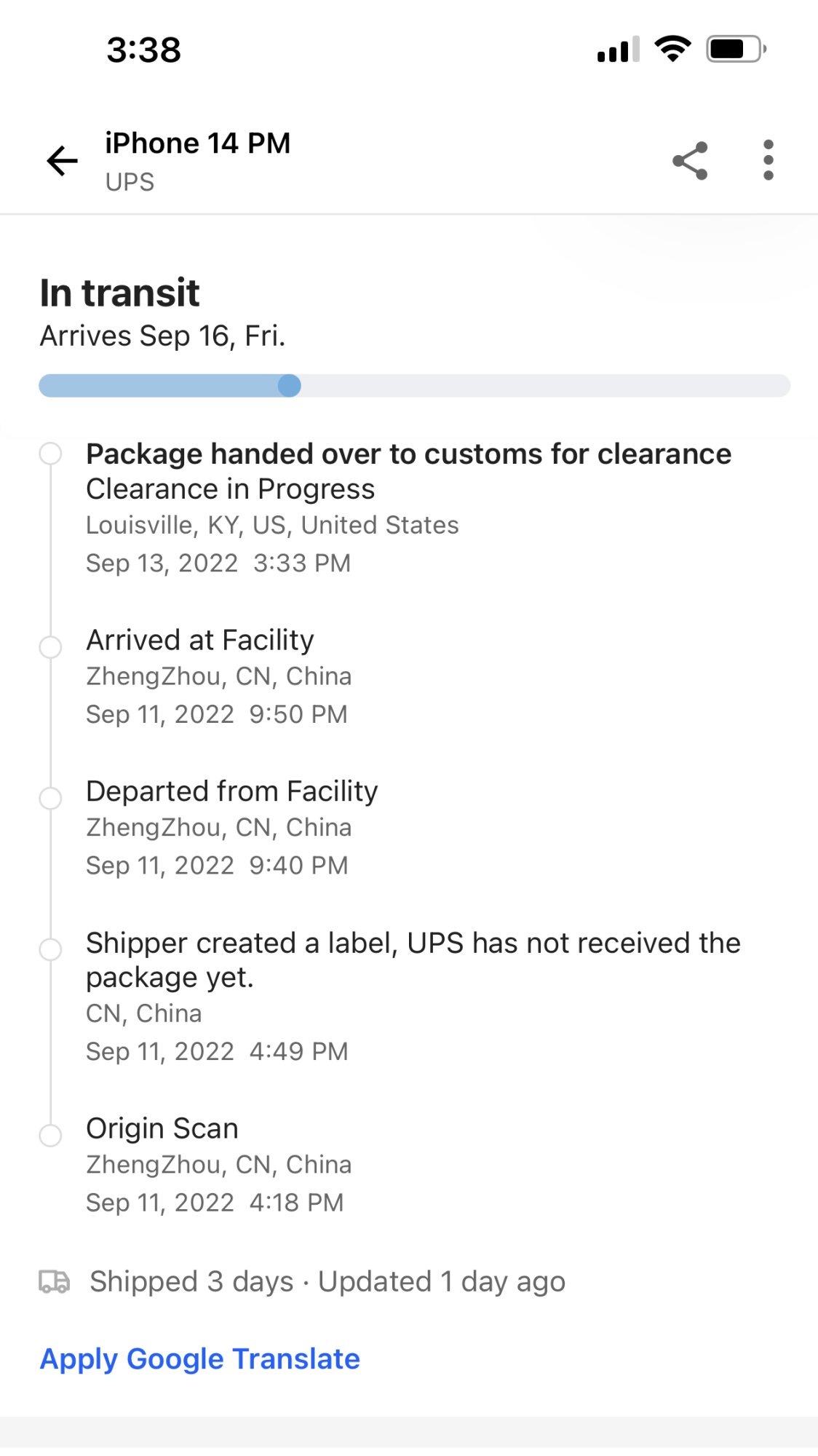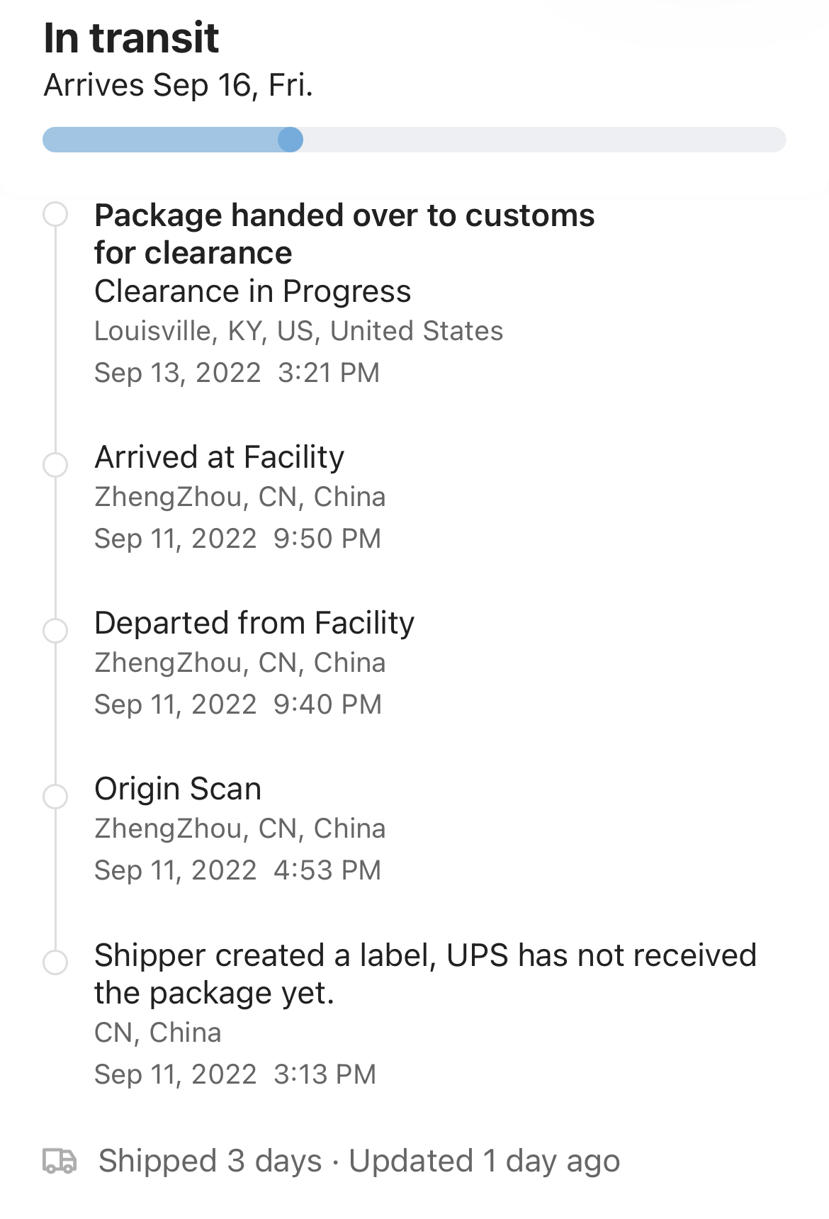 My Pro Max 512GB Deep Purple iPhone does too. Same time. Same info. Which phone did you order?My order for 14 Pro is scheduled for Friday 9/16, ordered from Apple. UPS My Choice still shows in ZhengZhou, China Mainland since 9/11 - should I be concerned?