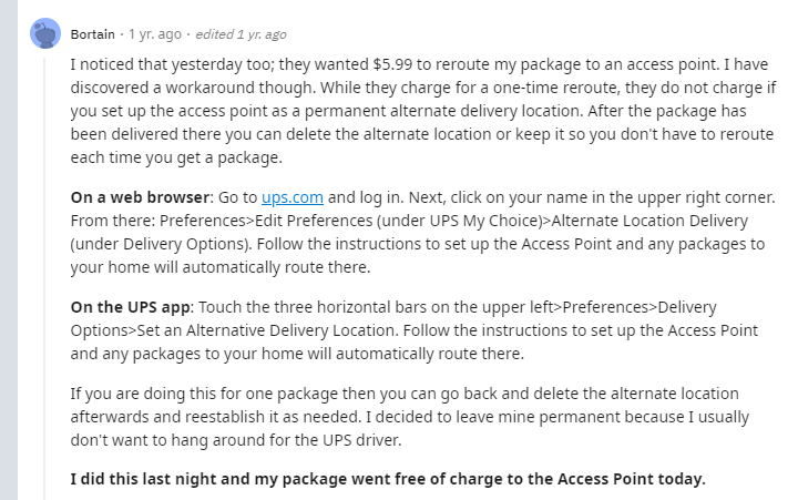Very interesting, thank you! For me it only shows non-CC Access points, so stores etc. I believe that will add a day to delivery. Dang, cool option otherwise!Regarding UPS $5.99 Fee. I found this. Looks like there are ways around it. check it out.