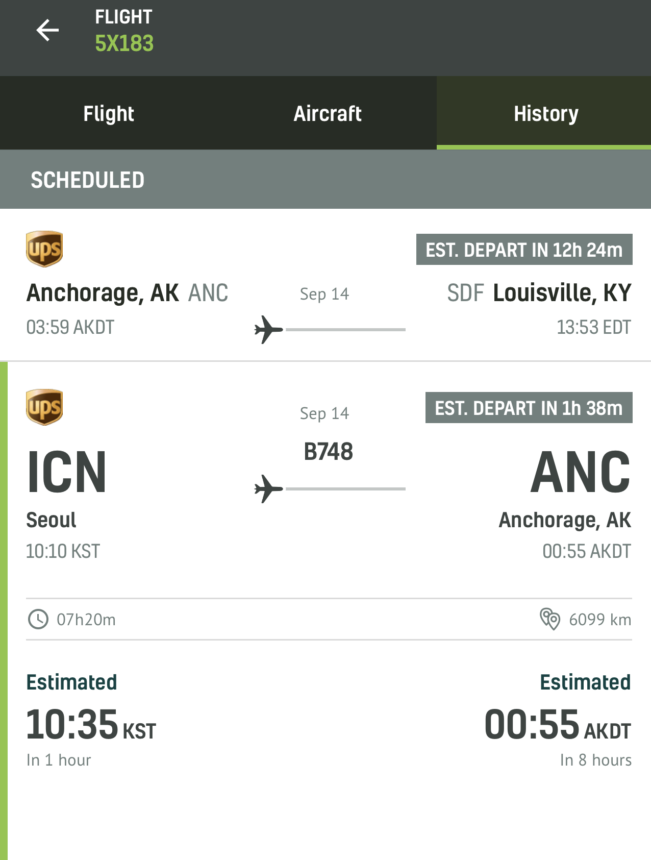 I'm confused, because on FlightAware, it tells me that UPS175 took off from WeiHai, not from ZZ.Pretty sure it was UPS175. See below. UPS 183 could be the same plane, but I don’t see the tail number yet.