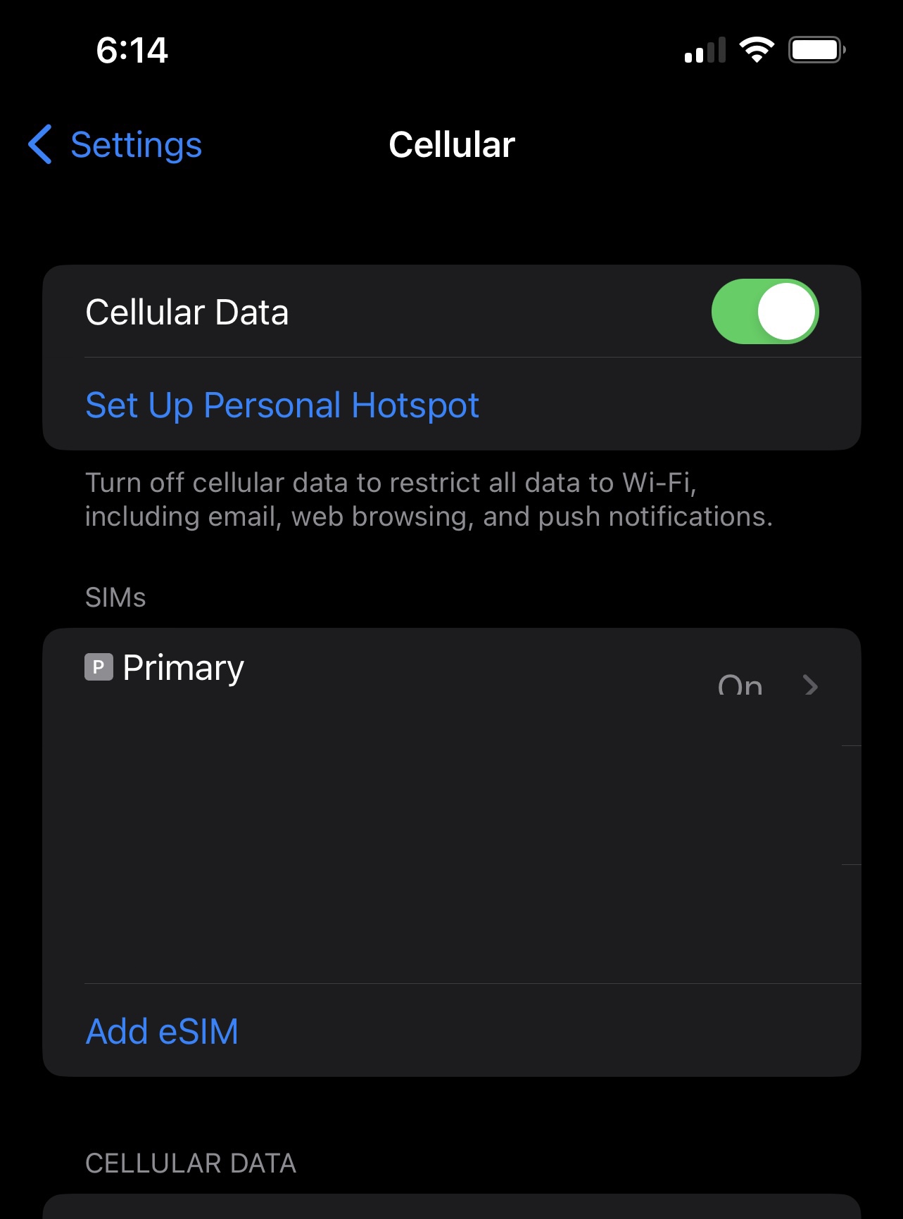 What dose the first screen when you get into the cellular settings looks like?Thank you! I have AT&T and how come I’m not seeing E-sim option?