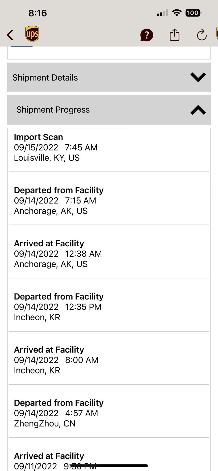 | 9/15/2022 07:59 AM | On the Way Import Scan Louisville, KY, United States |