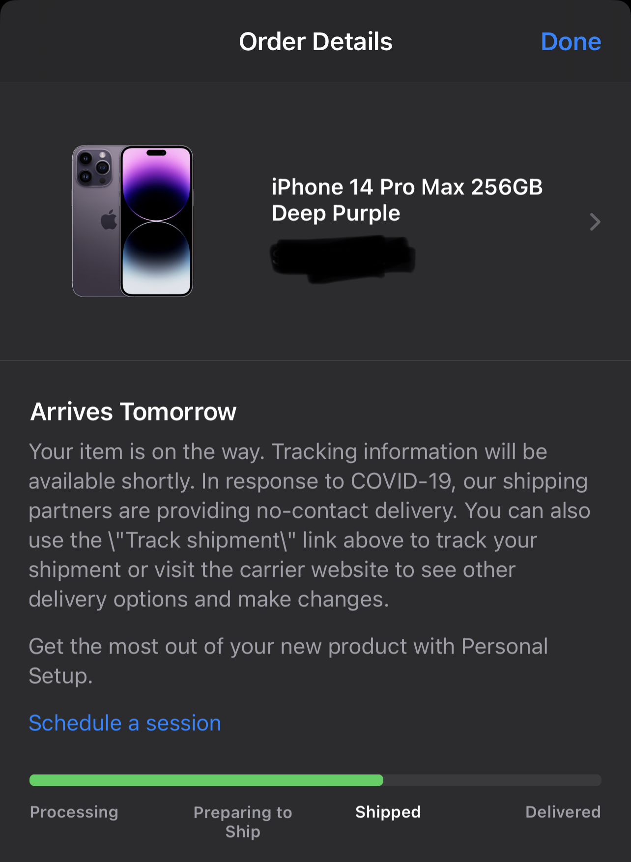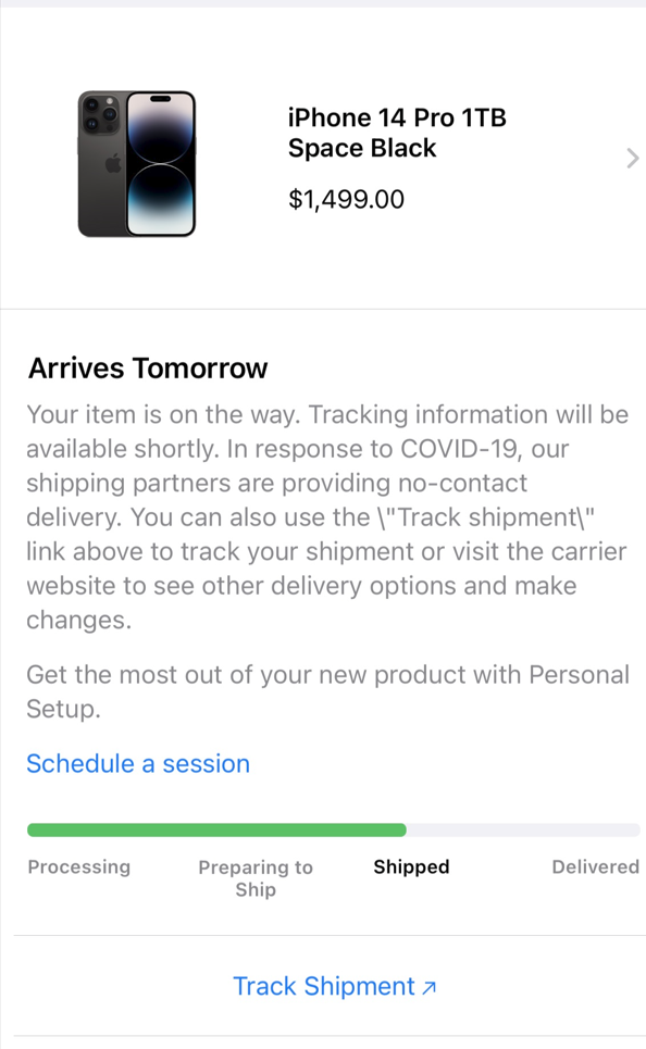 Store about my iPhone being shipped. I haven’t got the email yet though. I checked the Apple Store app and I see my status is now “Shipped”. I also got the AppleCare+ email. It’s happening!🥺