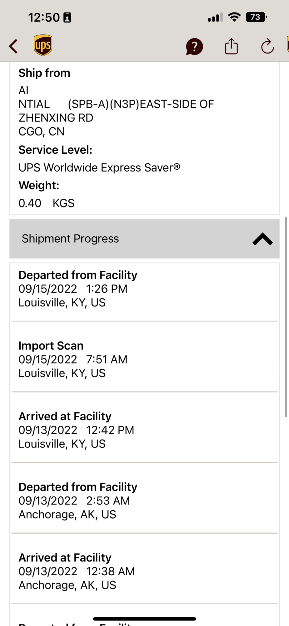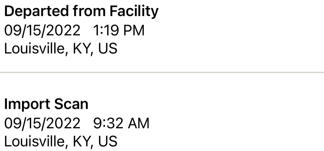 This is approximately the current time on East Coast. We should be seeing "Departed from Facility", in Louisville, Kentucky soon.
