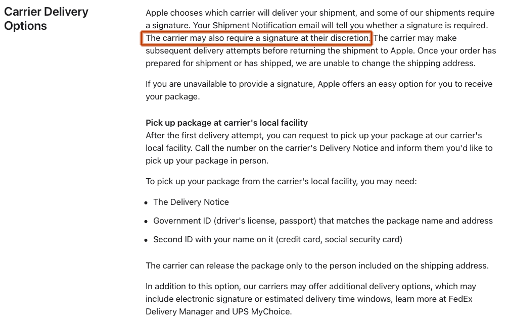Per Apple, signature is at the discretion of the shipper (and that can vary by region as well as designated service level), and this therefore determines whether or not you can pre sign or not.