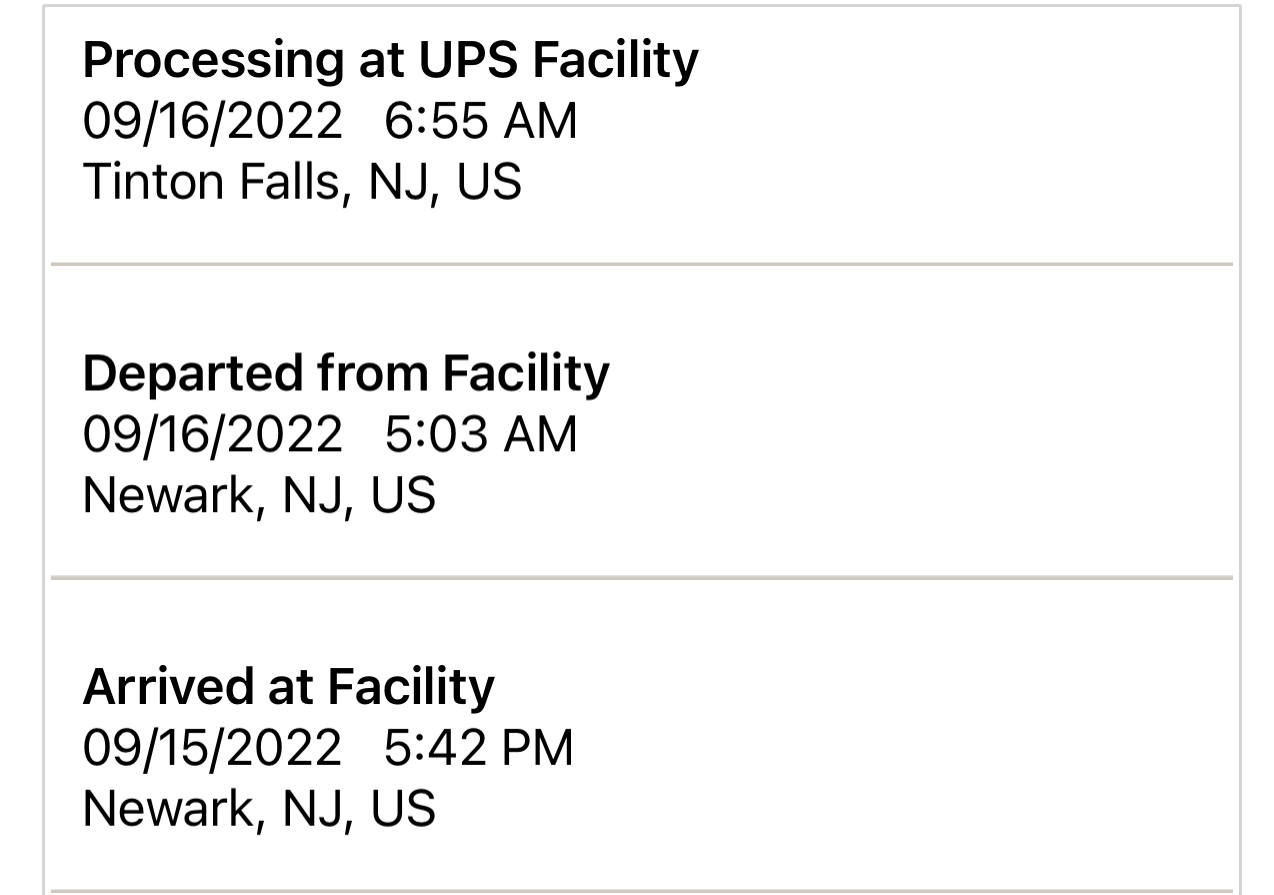 My 5:03am departure scan from Newark didn’t show up until over an hour later. Just arrived to my local hub at 6:55. 😅6am eastern. Still no update on tracking other than the phones got to Newark yesterday evening.