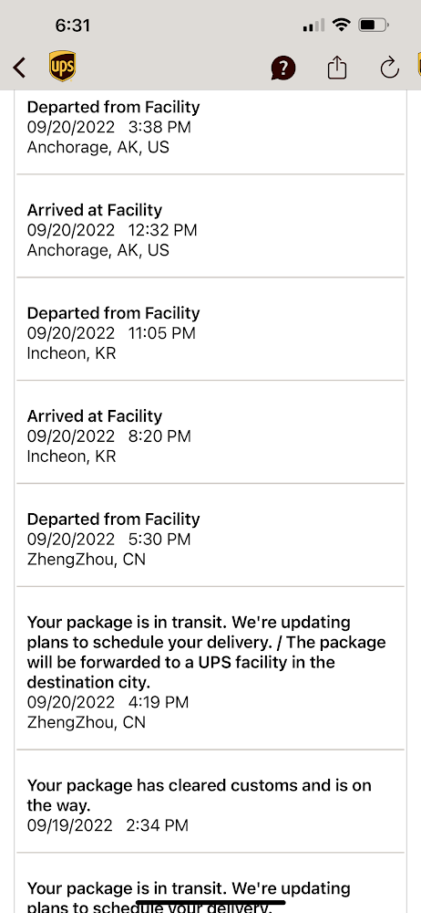 Wild guess, IF your arrival scan was in INC about 5 hours ago you are probably on this flight (5X89, plane registration N581UP). Probably you'll get that departure scan before ANC, but no guarantees. Tomorrow you'll see it did depart ANC, but you'll not see any arrival scans in SDF, first thing will be an Import Scan probably on Thursday.