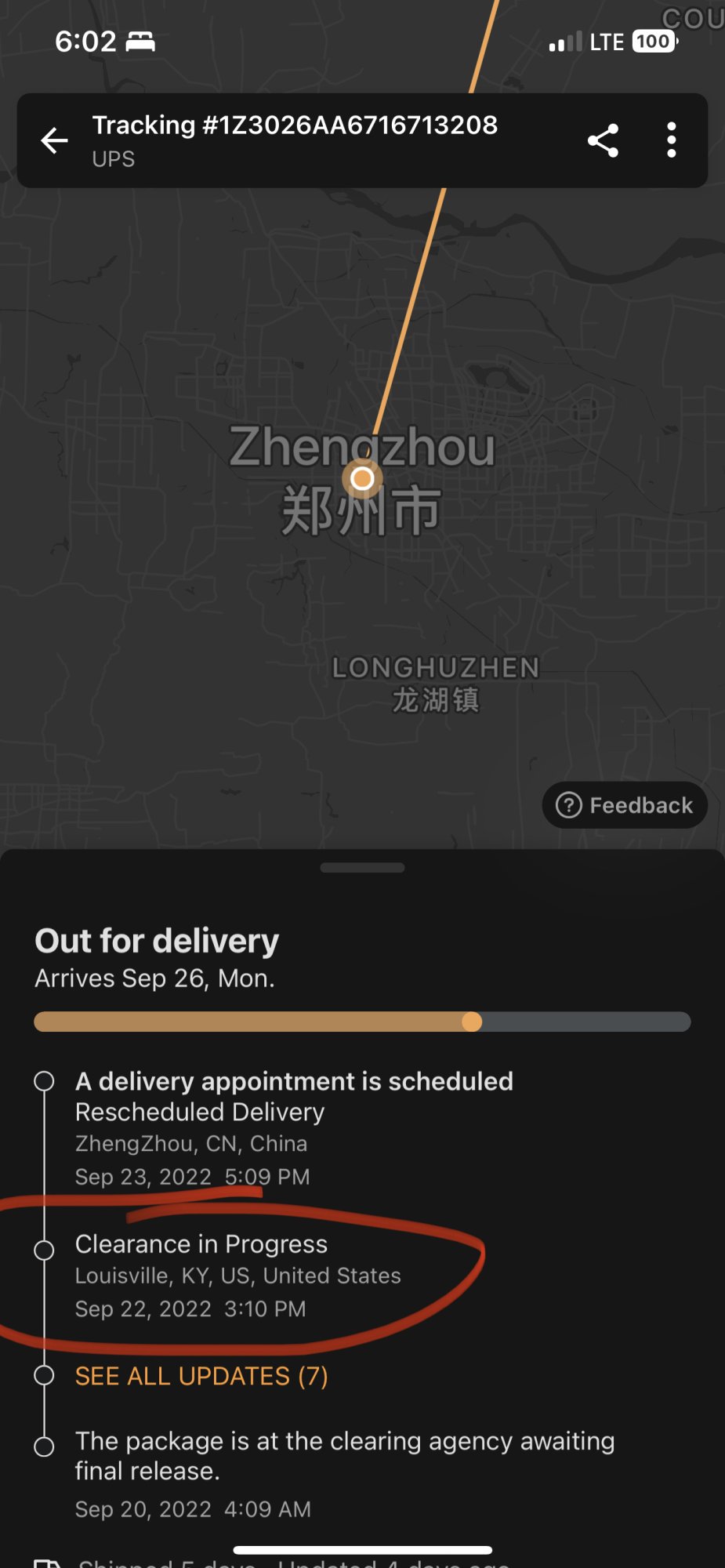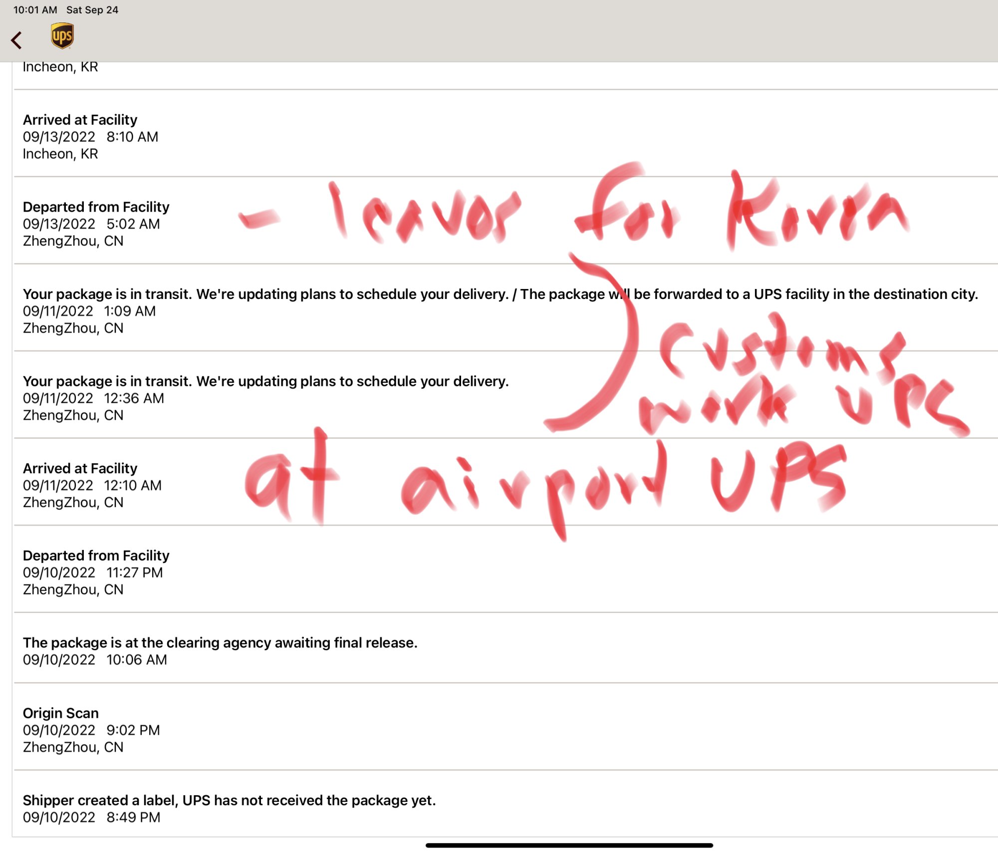 UPS scan final note when most UPS customs stuff happens (annotated in red) this is where airship can get messed up because the scans are going through main computers at UPS Louisville hub and airship interprets that package is in Louisville and it is only the electronic info. Your phone still in China. Once you see the Korea scans and a depart after that customs work in china at Or near airport you will also see a departure scan then eventually after a couple hours Korea appears. That is when your phone is really moving.