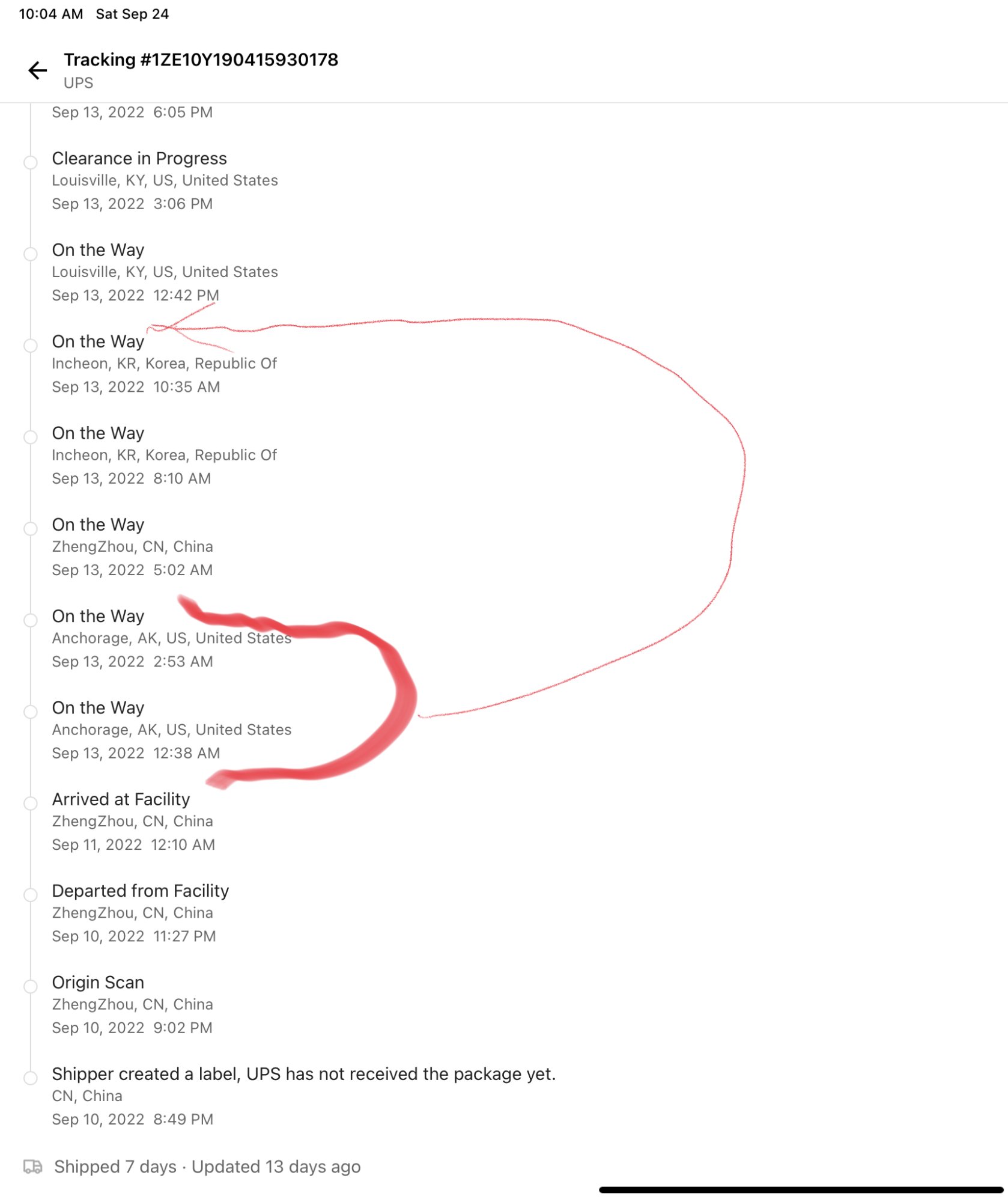 Here is airship notice what it gets of UPS scans, that the anchorage stuff is shown erroneously before Korea because of the day difference by 11 hours across international date line in pacific. That also can be confusing til you realize that. UPS has smarter programming and adjusts for the time line so you see where it really is ā once it populates but from China to Louisville and sometimes your house their scanning is delayed closer to end.
