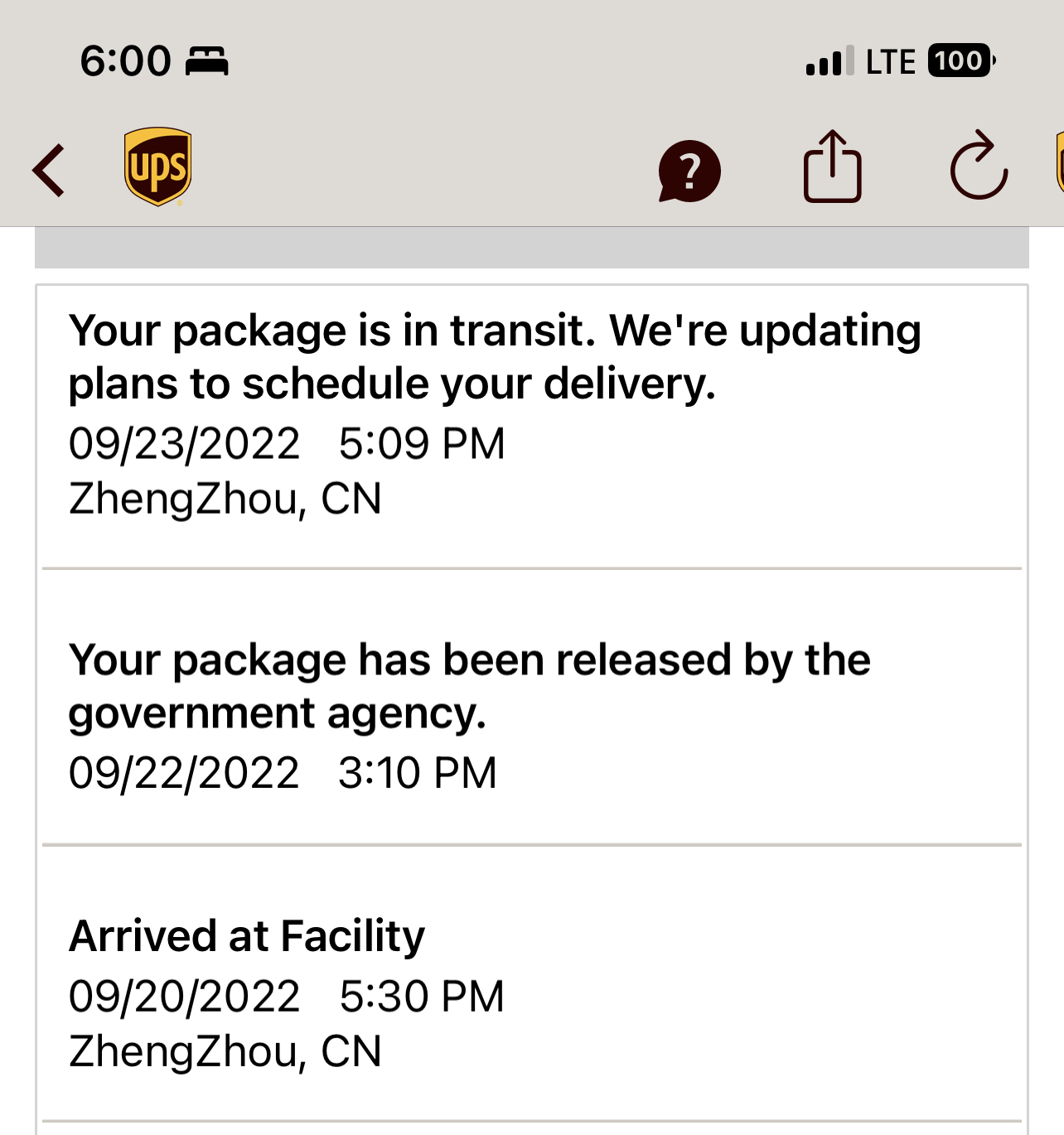 The other problem with airship is that it does not distinguish the time zone differences so all things on 10/13 which were across the pacific time line show arrival at Anchorage for example (see below in second tracking from airship) before Korea. Airship does sometimes get things in scans that UPS does not show til you have the package and all the scans on their system show up in as much detail as they are going to give you. The difference between final UPS scans after package arrival and during transit out of China are often 50 percent of the scans missing. Sometimes they appear after import final scans in Louisville and sometimes not til I have the phone in my hands. So tracking details can be a bit fun. Things usually get better after leaving China and once they hit Korea and then Anchorage