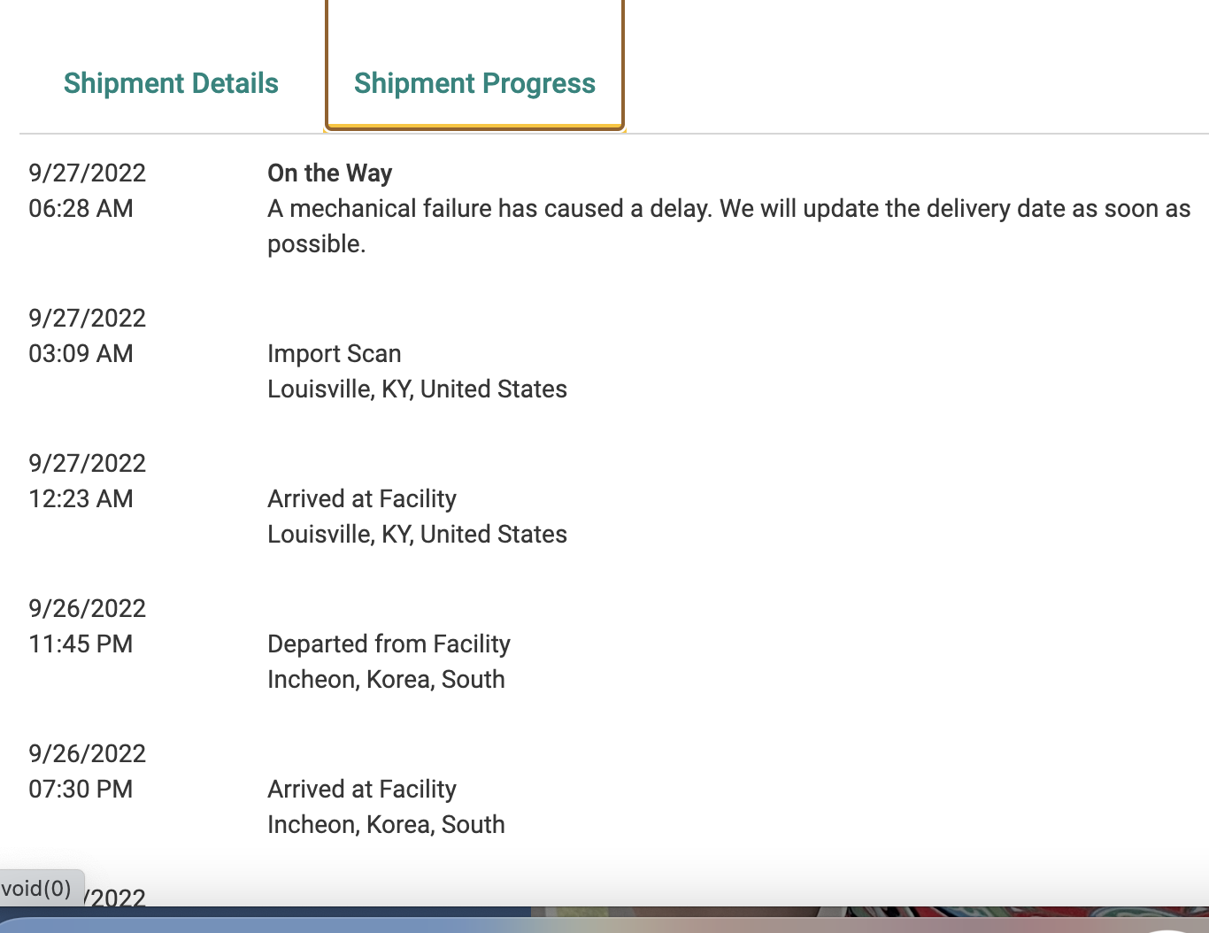 Strange thing is that it now shows an estimated delivery date of TODAY (09/26/2022) by 4:45 PM (Eastern). If those Korea scans are accurate it is making the trip from Korea to me in NJ in less than 6 hours. I'll keep an eye out for the tiny parachute being thrown out of the jet going mach 1.5 and then immediately invest in UPS.