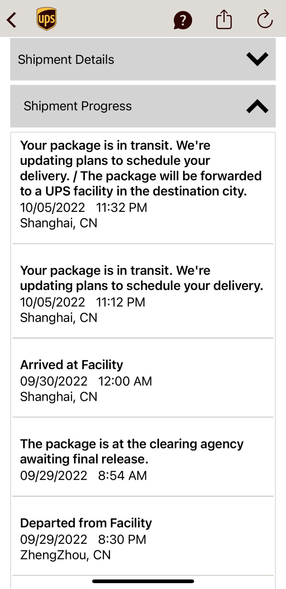 The package went from ZhengZhou China to Shangai and has sat there since the 29th. The UPS app has no tentative delivery date anymore but when I sign in to MyChoice it shows October 19th.