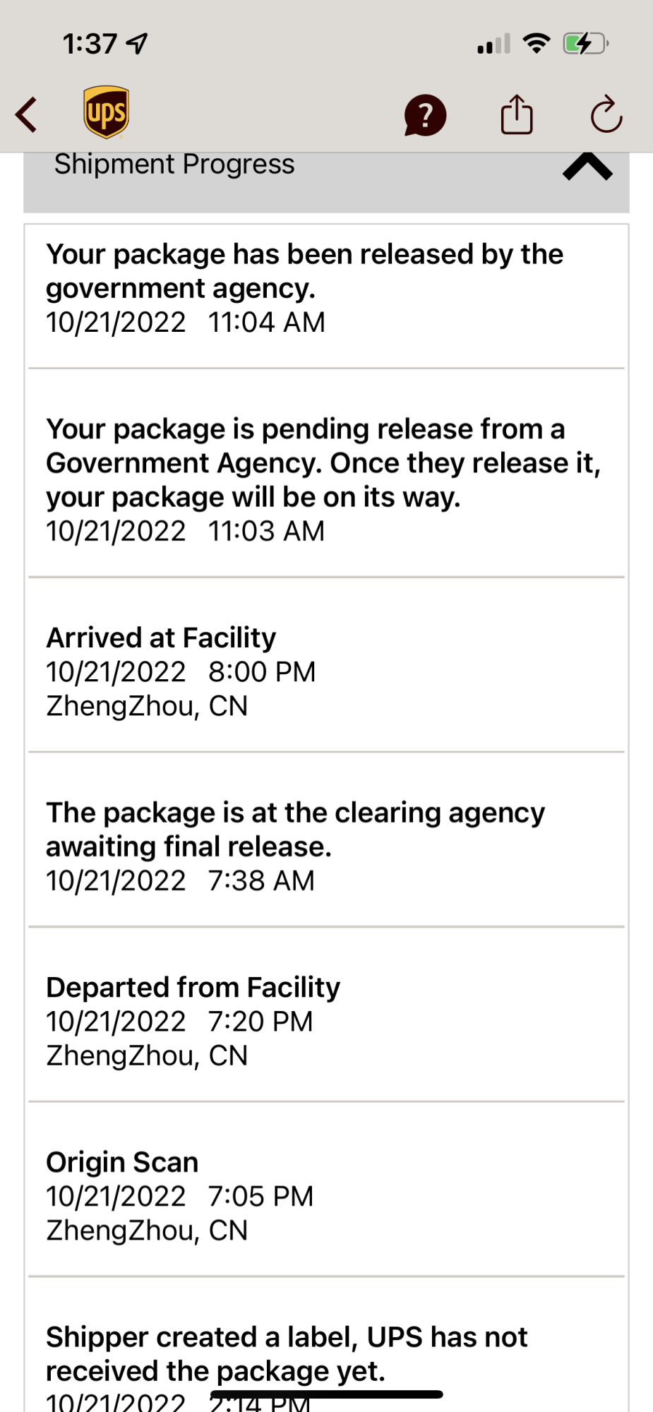 Are the scan times with UPS in our current time zones are China mainland. Mine showed that it cleared government agency today. Just trying to piece together the times.Does yours still say “The delivery date will be provided as soon as possible”?