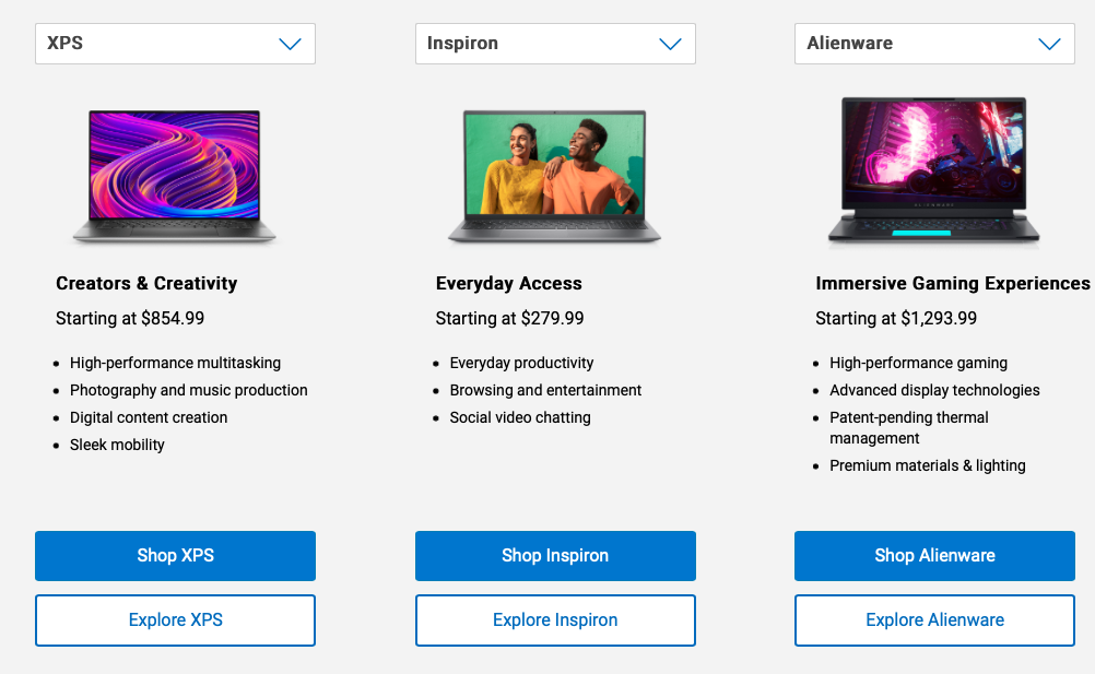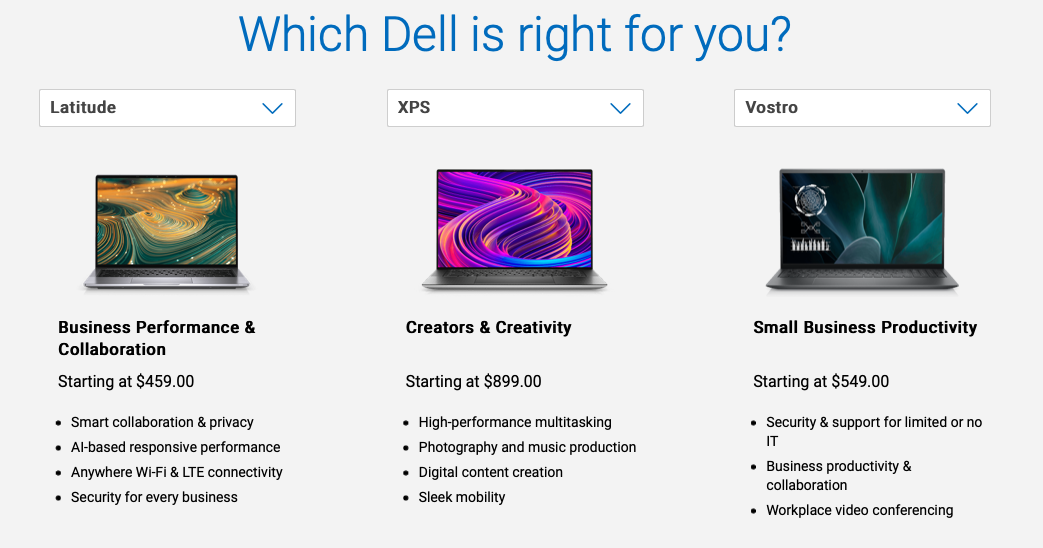 If you go to dell.com… do you want a laptop "for home" or "for business" (what difference does it make??)? Do you want an XPS, Inspiron, Alienware, G Series, or Chromebook? Or do you perhaps want a Vostro or a Precision?