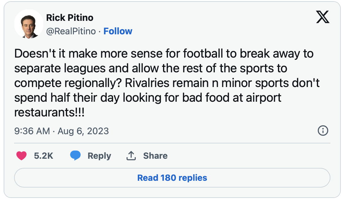 I personally hate all of this. These are college kids, not professionals (though with NIL, it's getting harder to tell), but they should not be flying all over the country, from one coast to the other. The conferences should be regional.